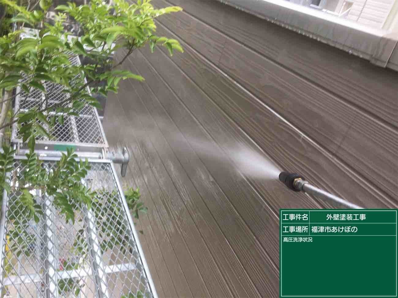 外壁の汚れを高圧洗浄機で一掃していきます。