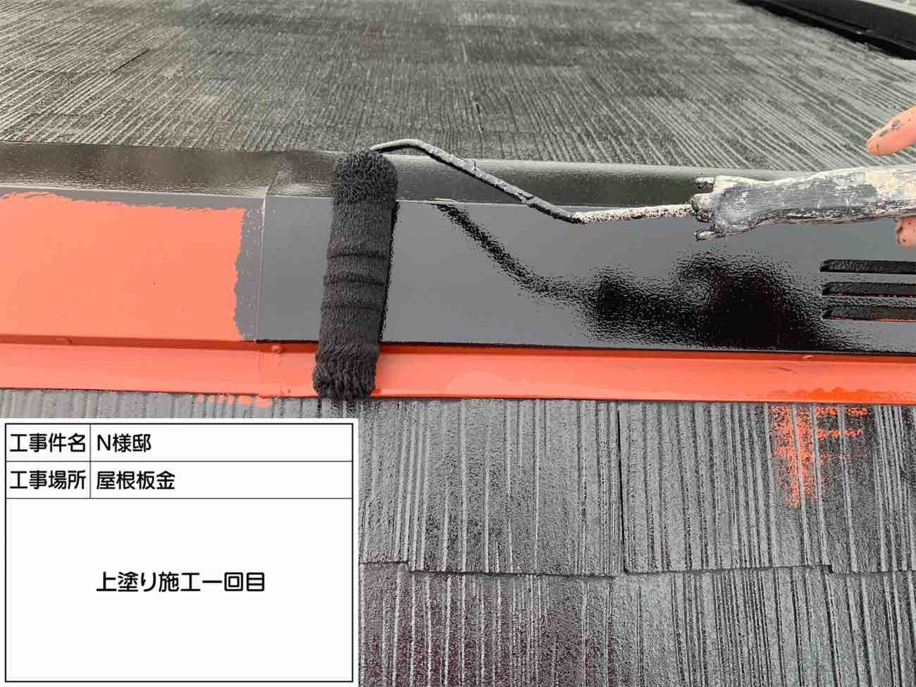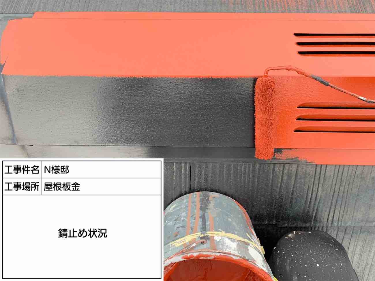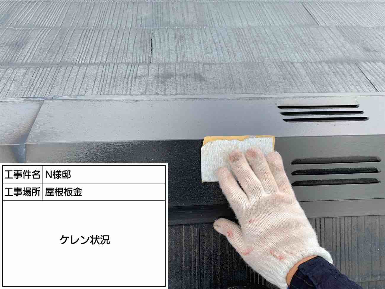 屋根板金のケレン作業の様子です。板金という名の通り、錆などが発生してしまいますので、ケレンで汚れを落とします。