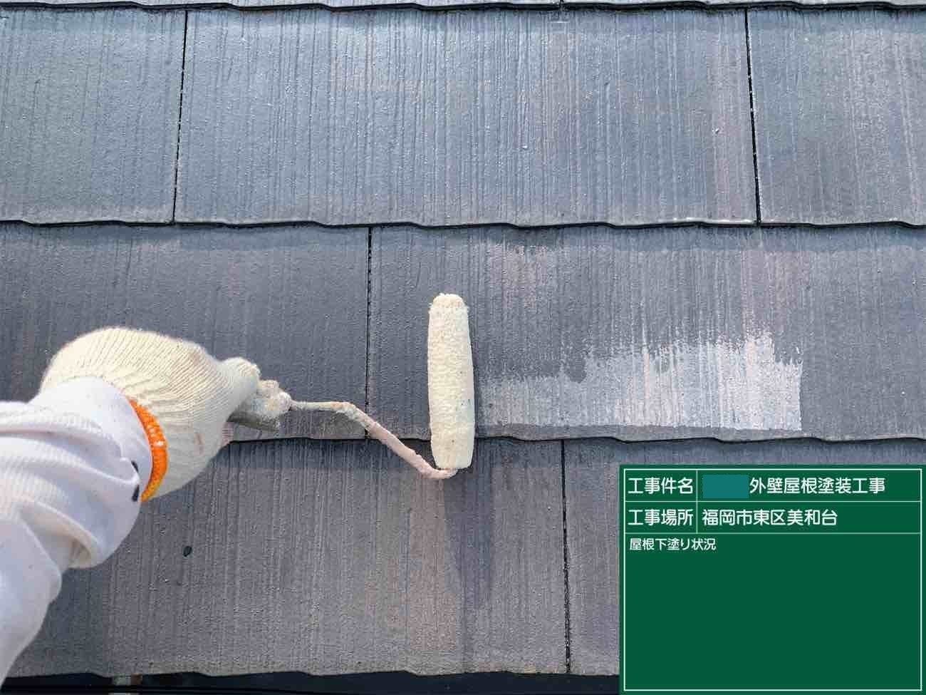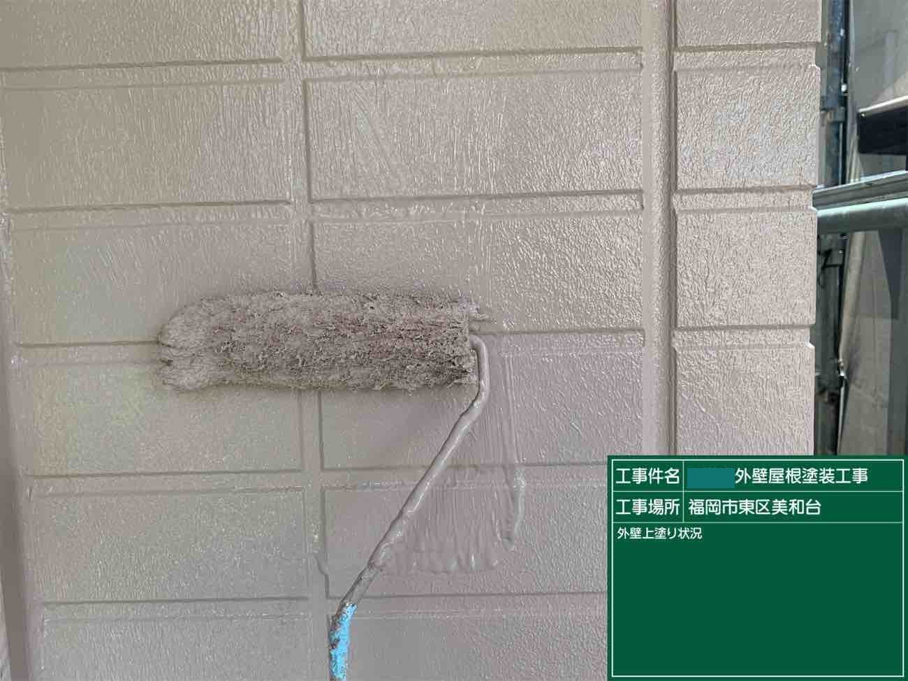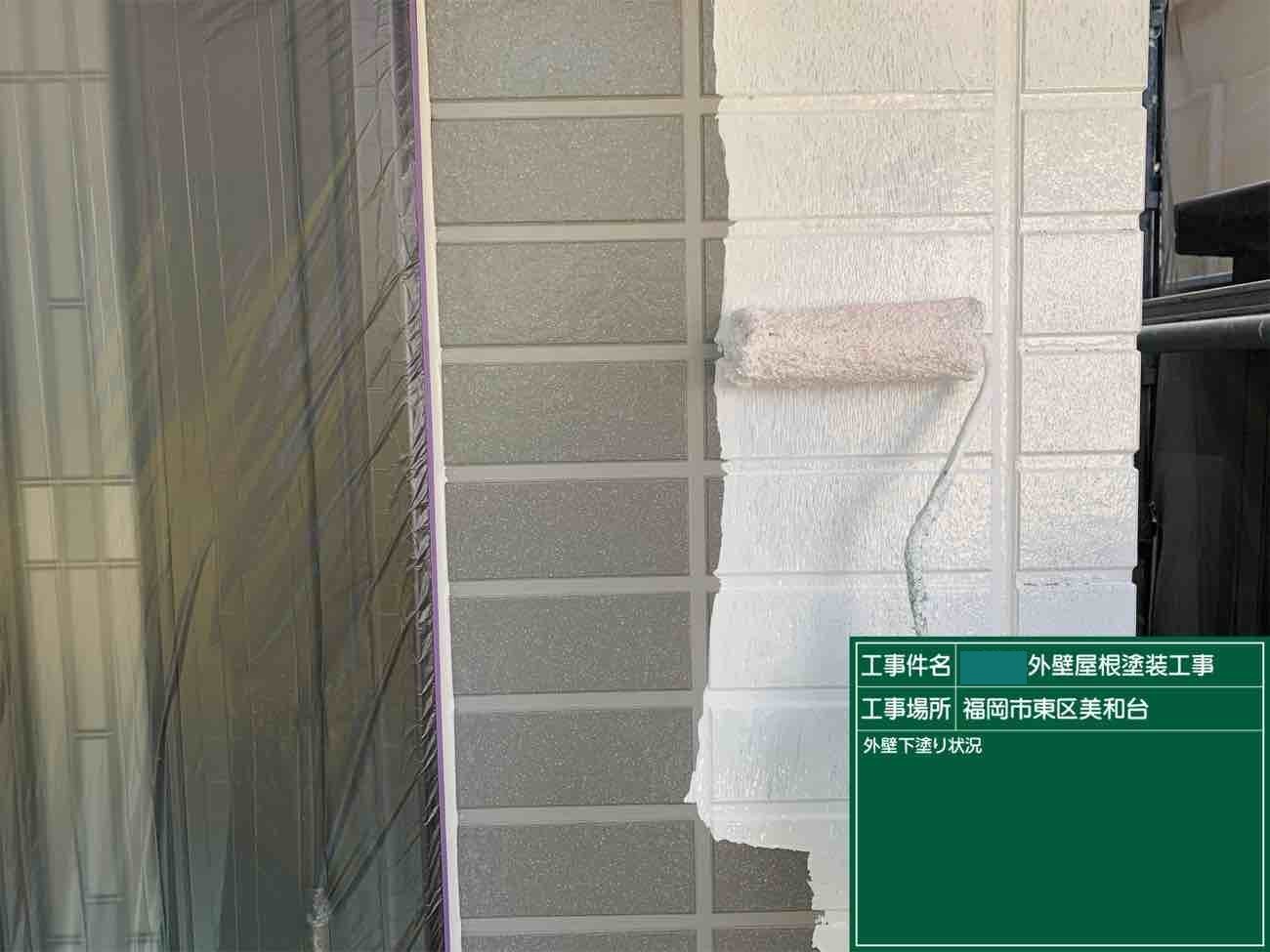 外壁の下塗り作業です。 下塗りをすることで、下地が塗料を吸い込むことを防ぎ、上塗り塗料と密着させます。