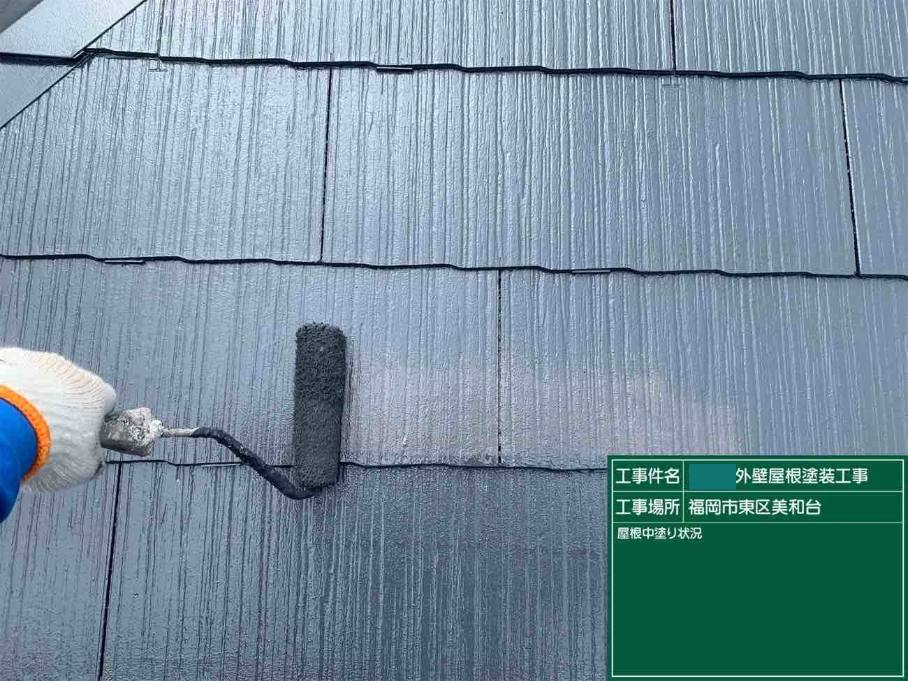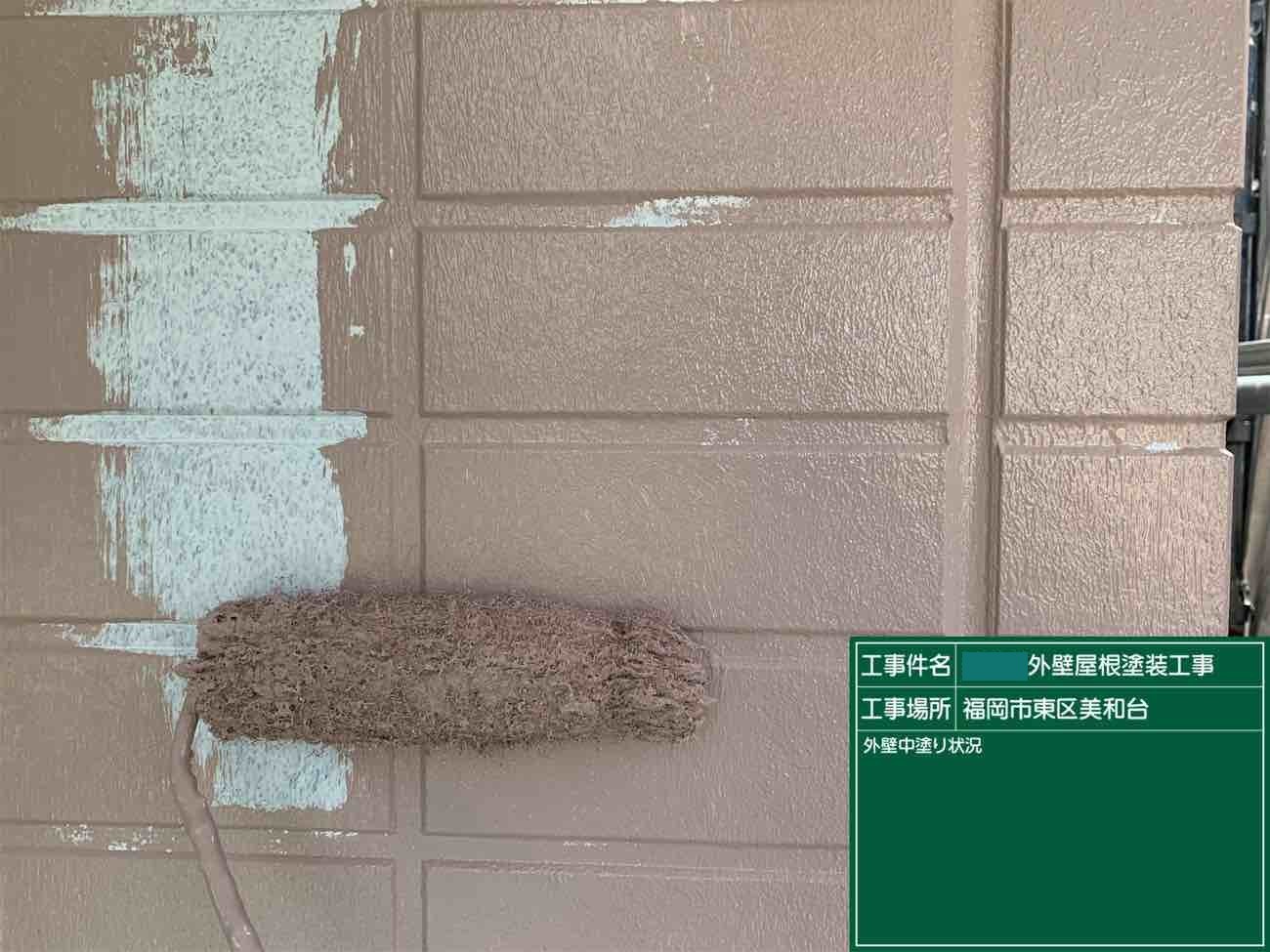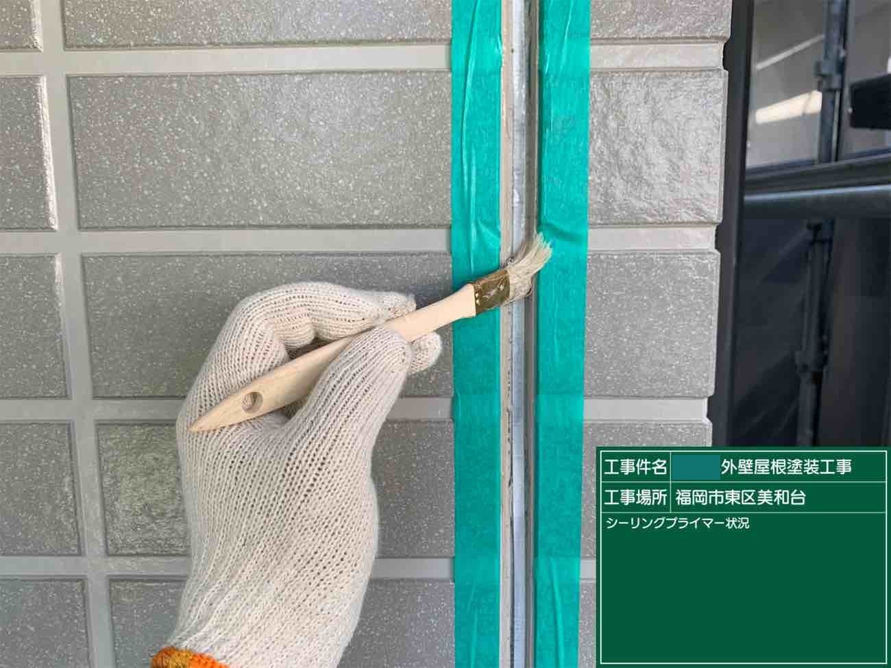 外壁の下塗り作業です。 下塗りをすることで、下地が塗料を吸い込むことを防ぎ、上塗り塗料と密着させます。