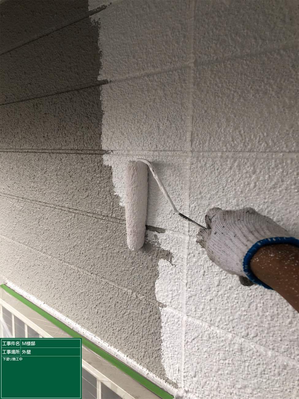 外壁の下塗り作業で中塗り塗料との密着度を高めます。