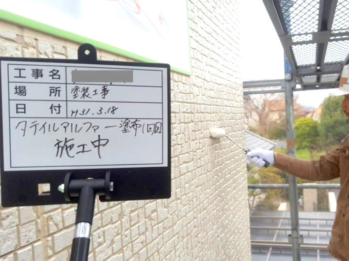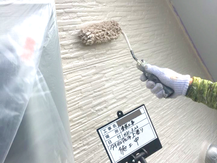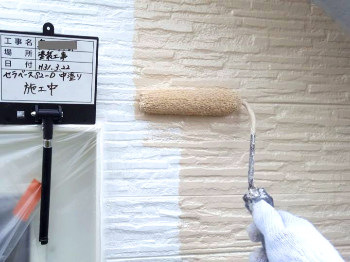中塗り材を塗布し、塗膜に厚みを持たせます!サイディングの凹凸部分、塗りムラなどが心配ですが、塗り残すことなく仕上げていきます!