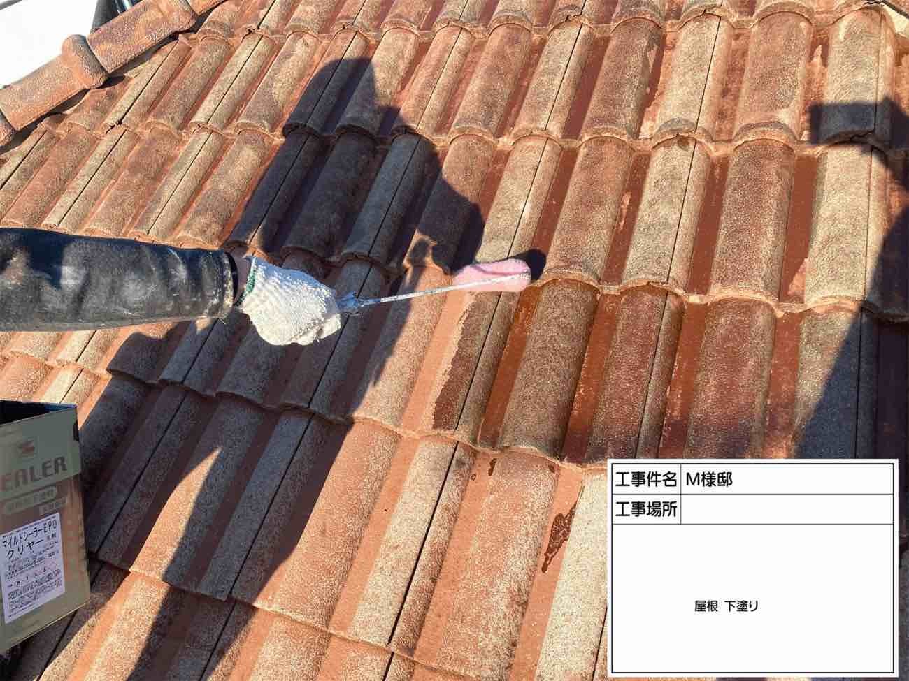 屋根の下塗り作業の様子です。 下地と新しい塗膜をしっかりと密着させるための大切な工程です。