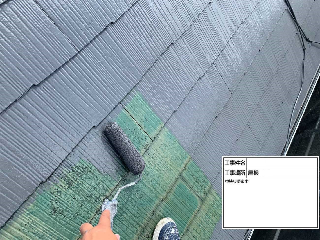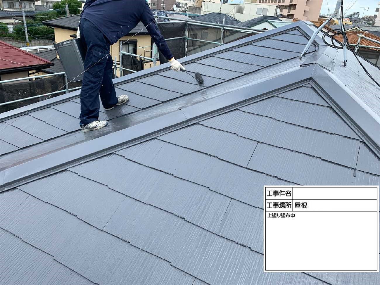 屋根の上塗りで耐候性を高めます。