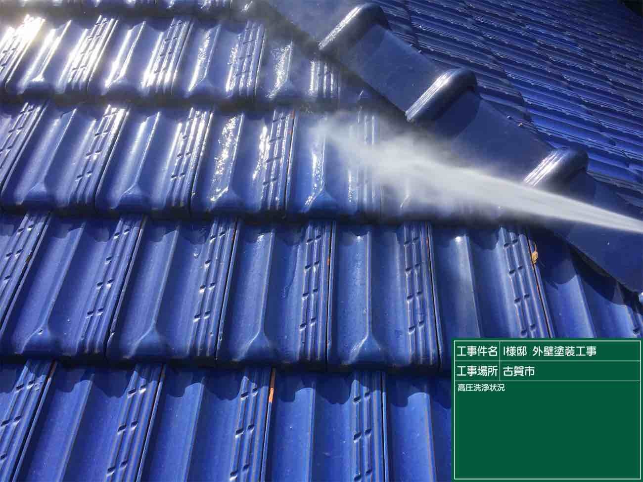 お屋根の洗浄作業の様子です。 高圧洗浄機で汚れをくまなく洗い流します。