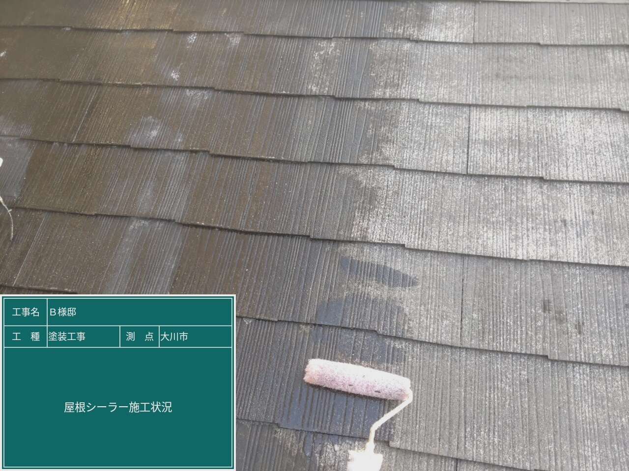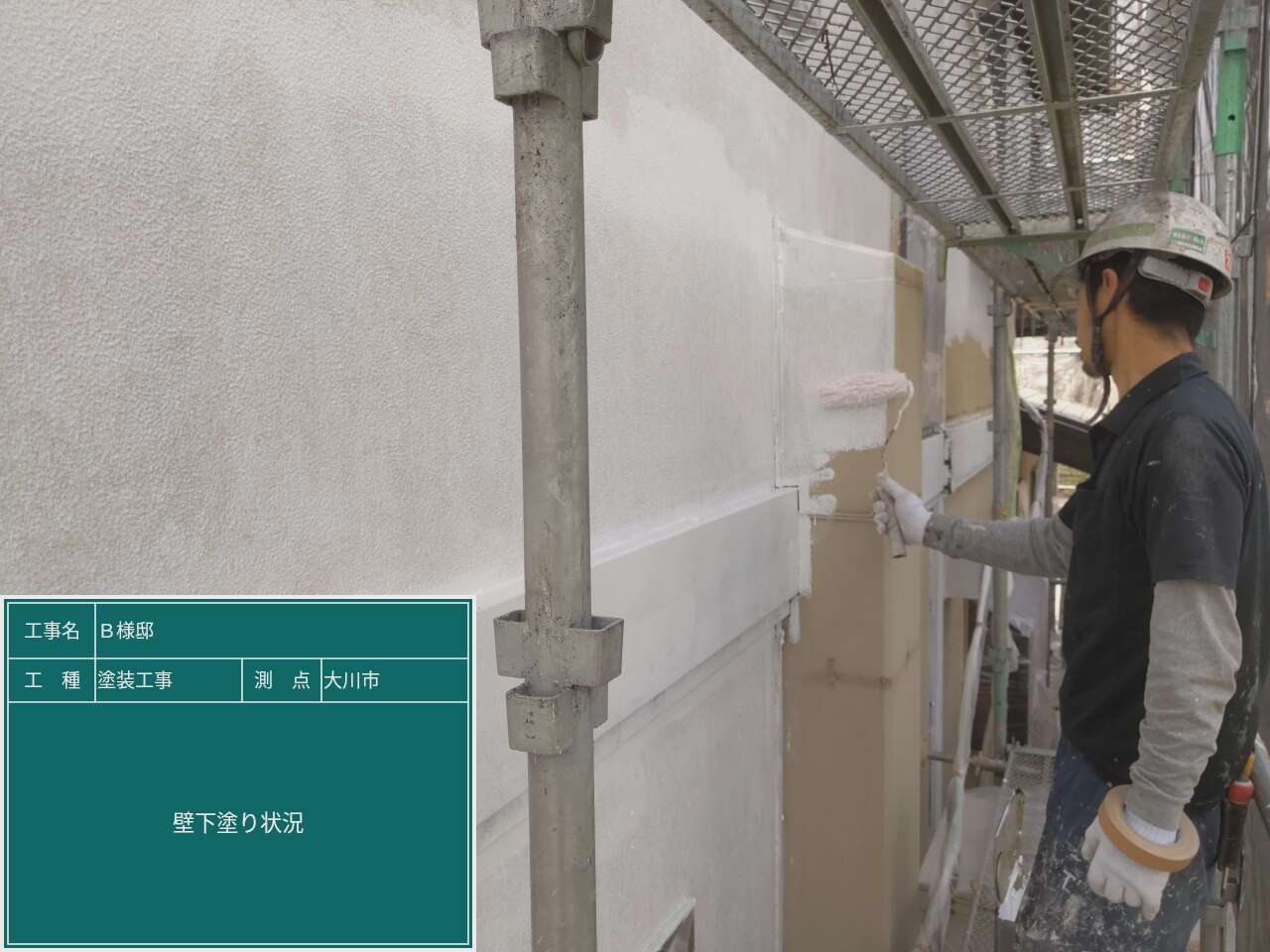 高圧洗浄でしっかり汚れや苔を落とした後にまずは下塗りから行っていきます。