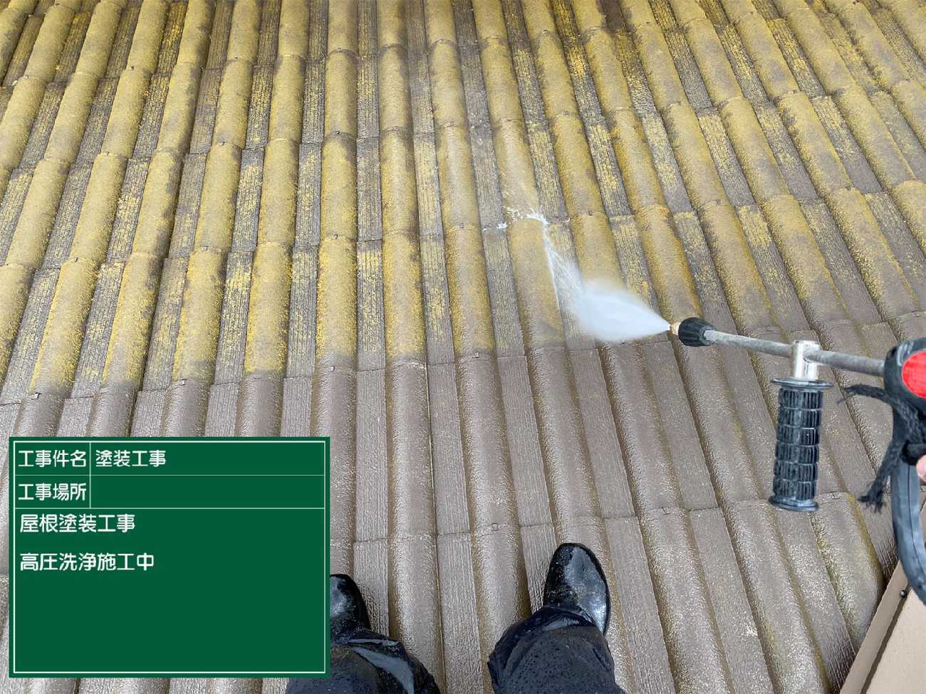 屋根から洗浄をしていきます。色あせやコケなどの付着もあるためしっかり綺麗にしていきます。