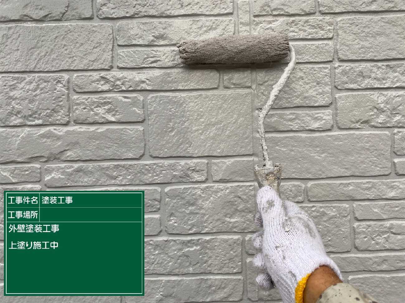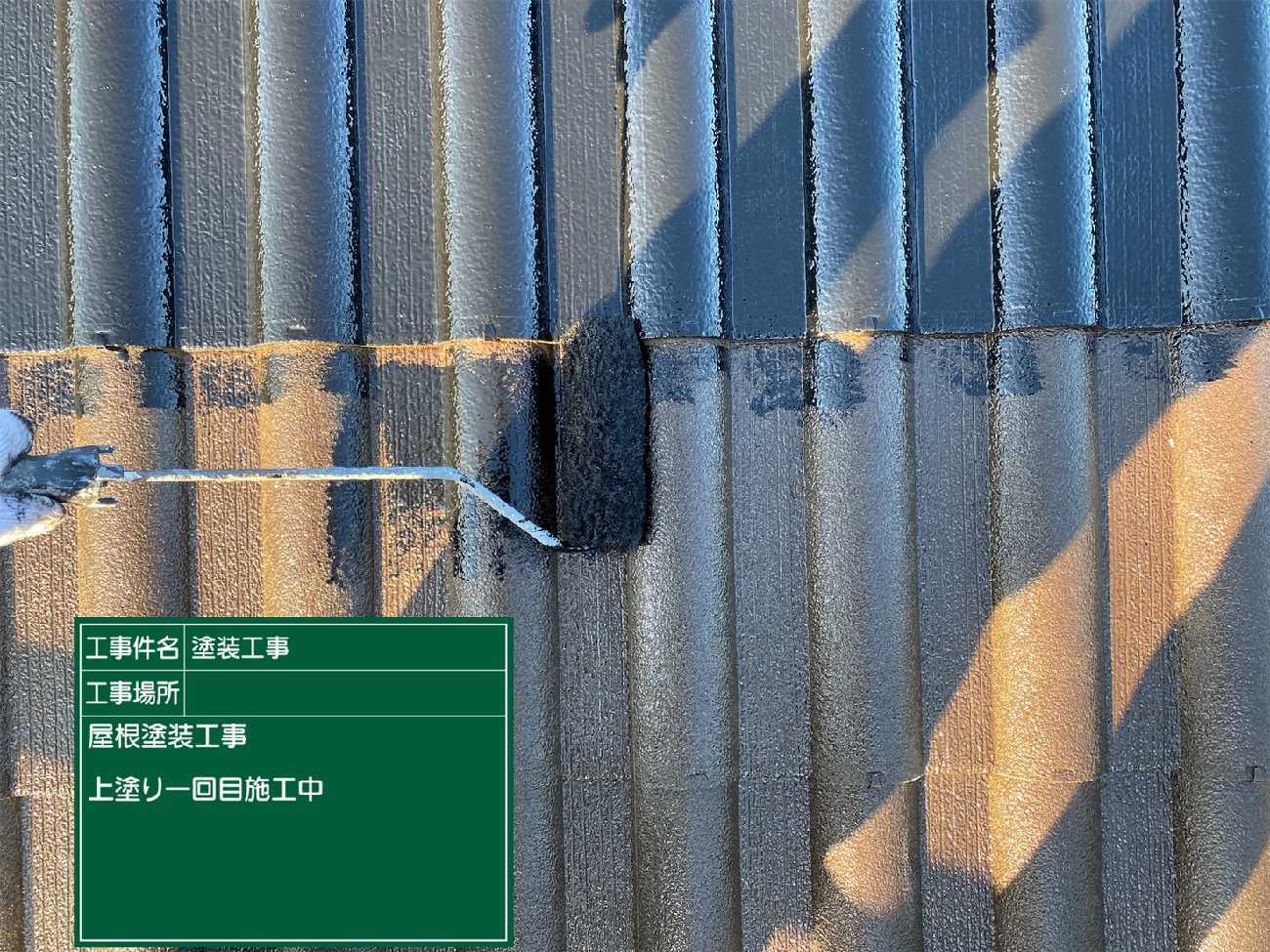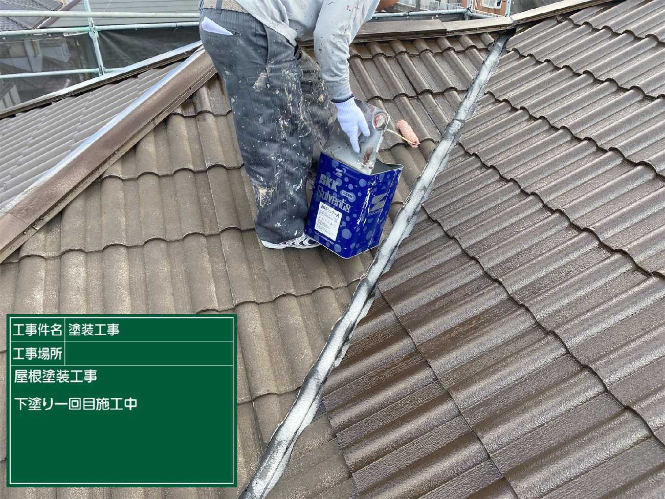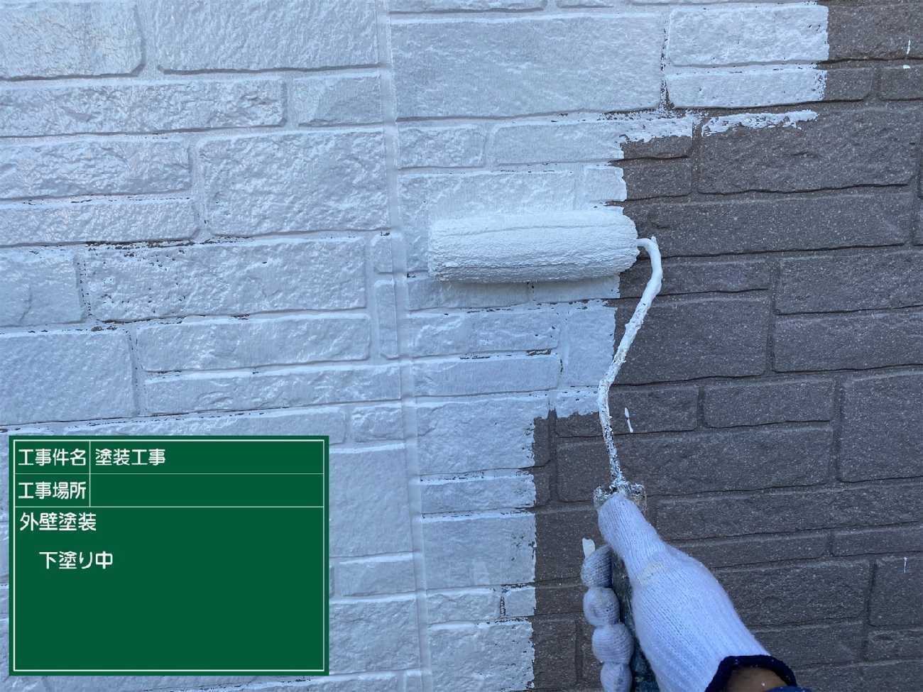 シーリング充填し乾燥までさせたら外壁の塗装を行っていきます。 屋根と同様3回塗りです。これは下塗り。