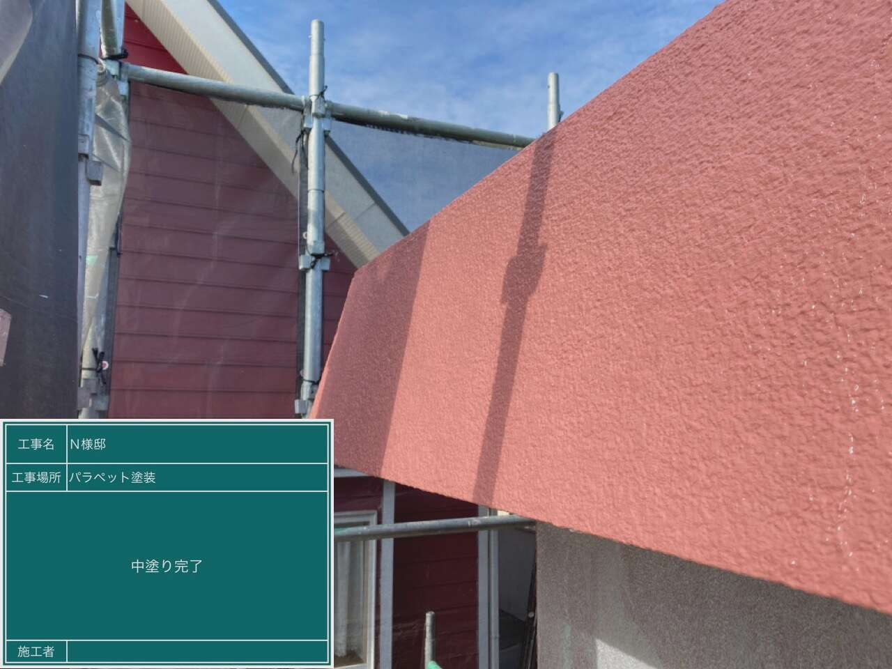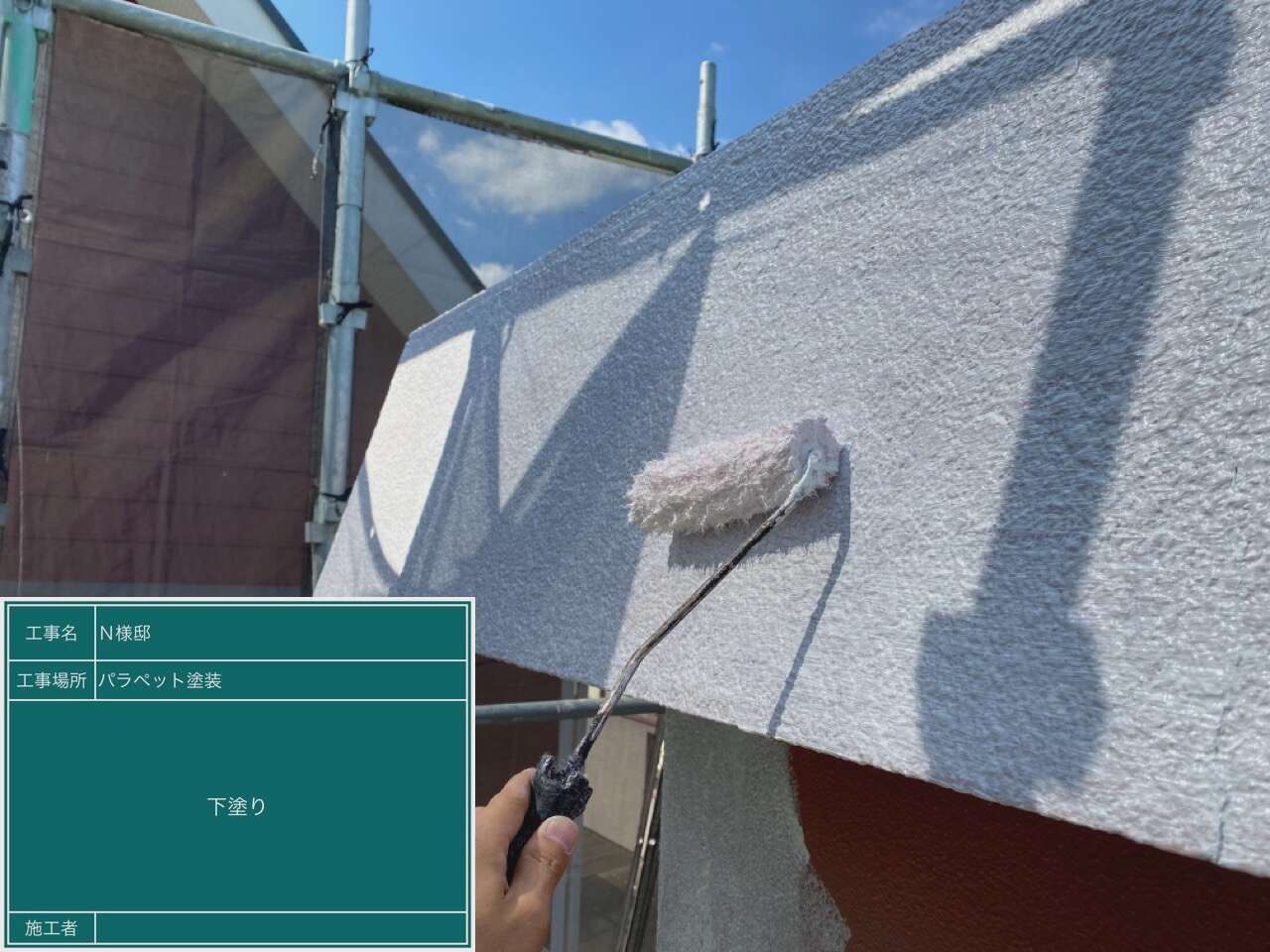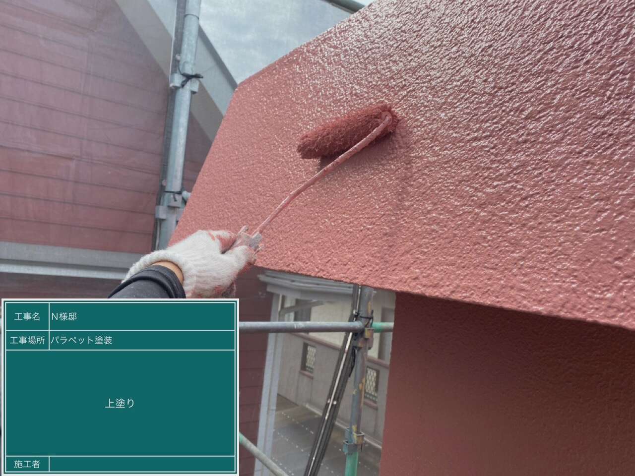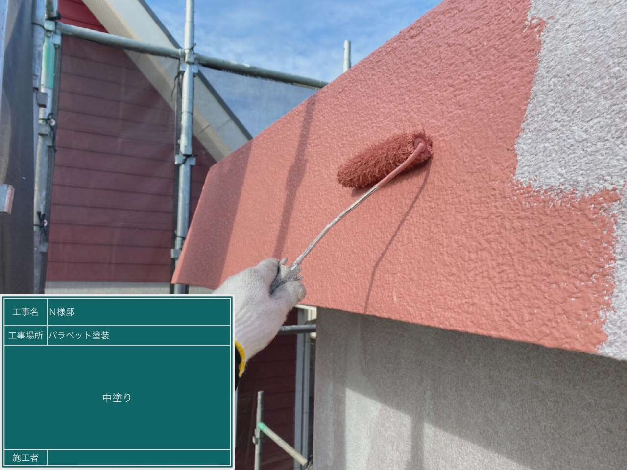 パラペットも外壁同様、中塗り作業で塗膜に厚みを持たせます。