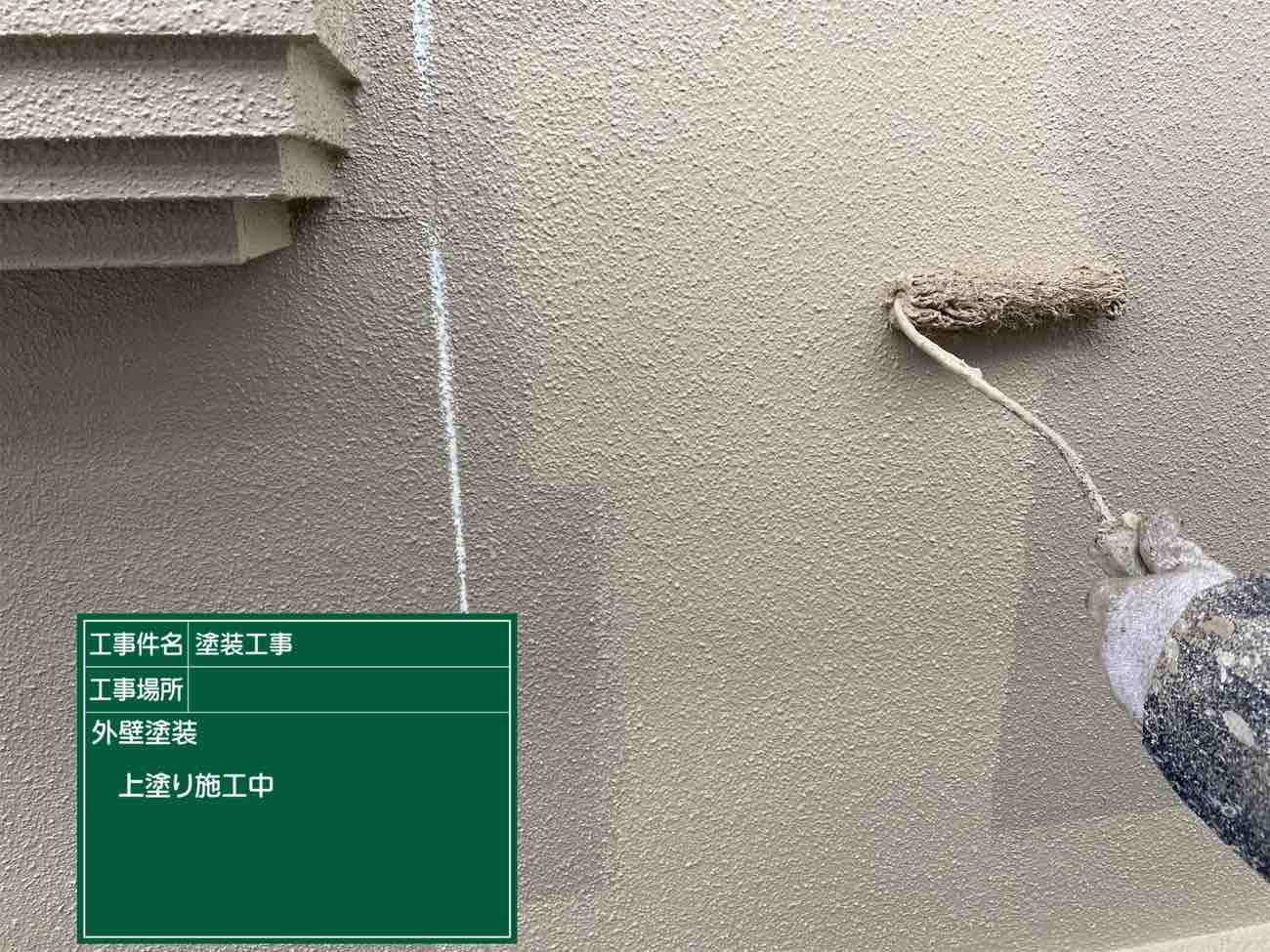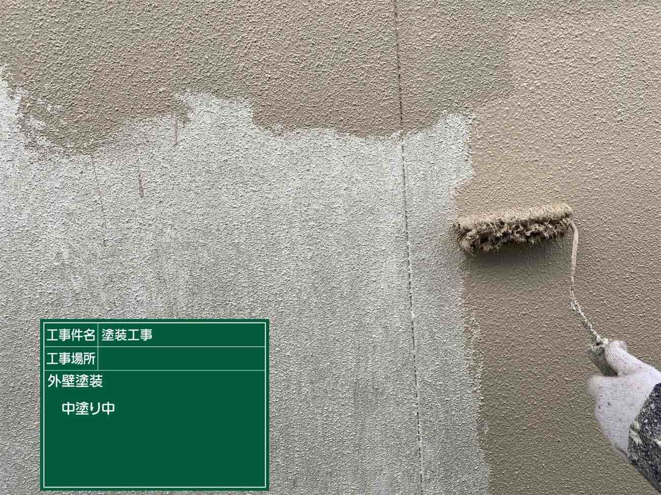 外壁中塗り作業です。中塗りで塗装の厚みをだしていきます。