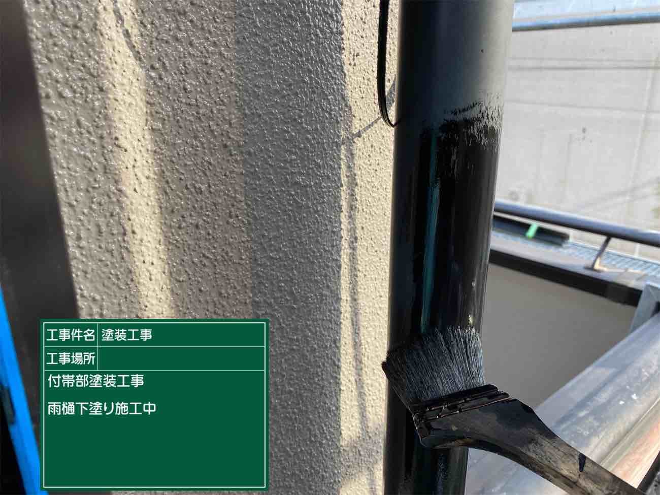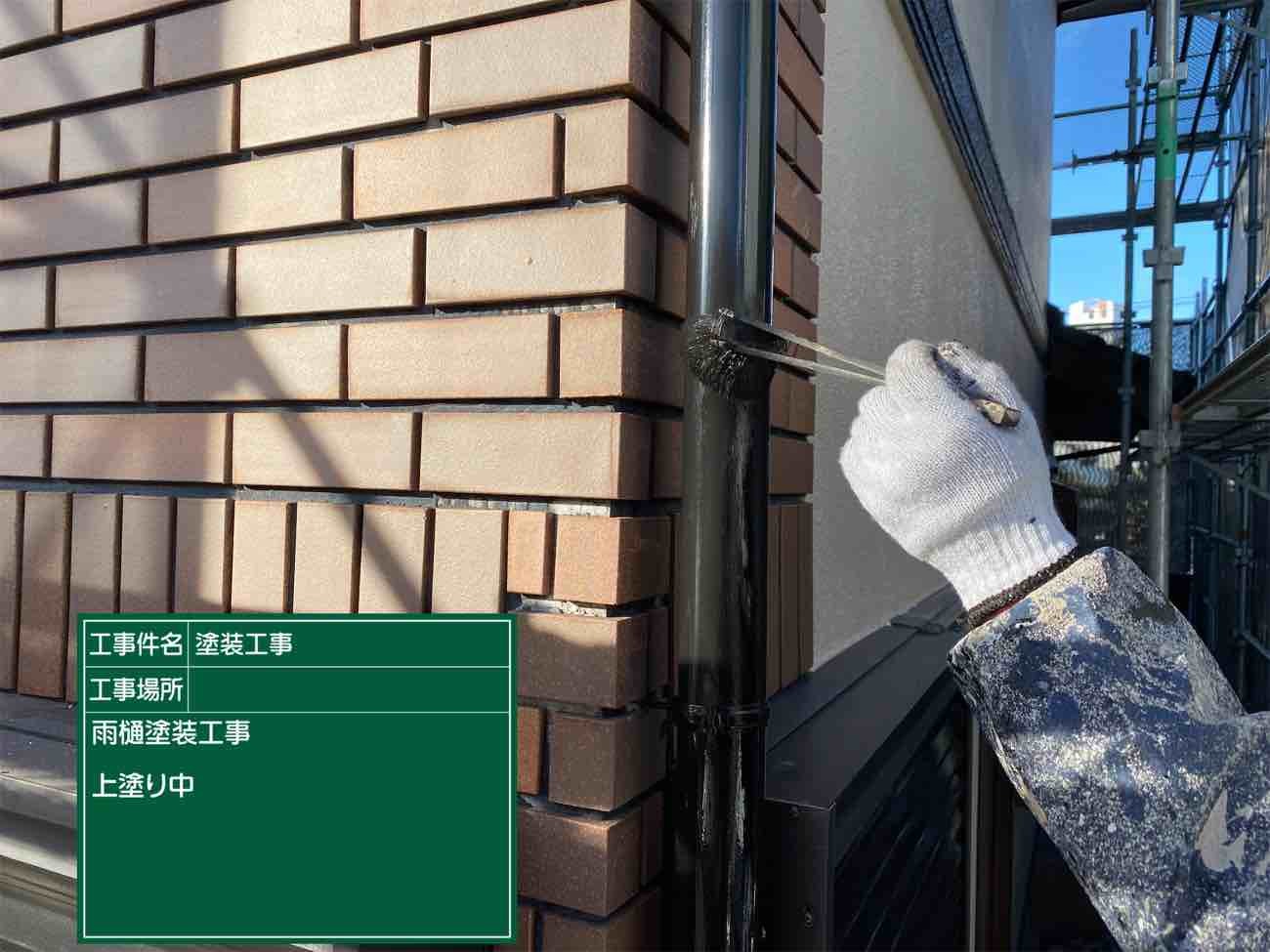 雨樋一回目上塗り施工です。雨樋等の付帯部塗装も確りしていきます。
