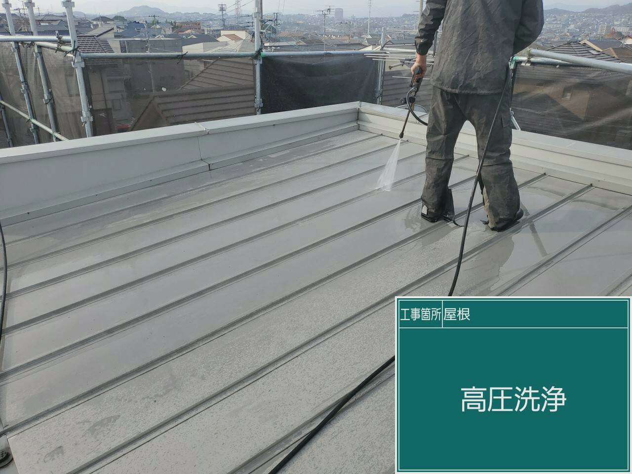 屋根の高圧洗浄を行います。 屋根に付着している、コケなどを落し塗装できる状態ににしていきます。