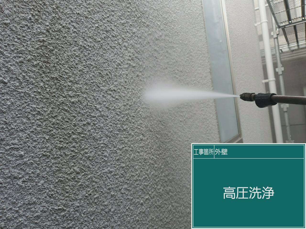 外壁も同様にきれいにしていきます。 高圧洗浄で汚れを落としますが、場所によっては圧力を変更していきます。