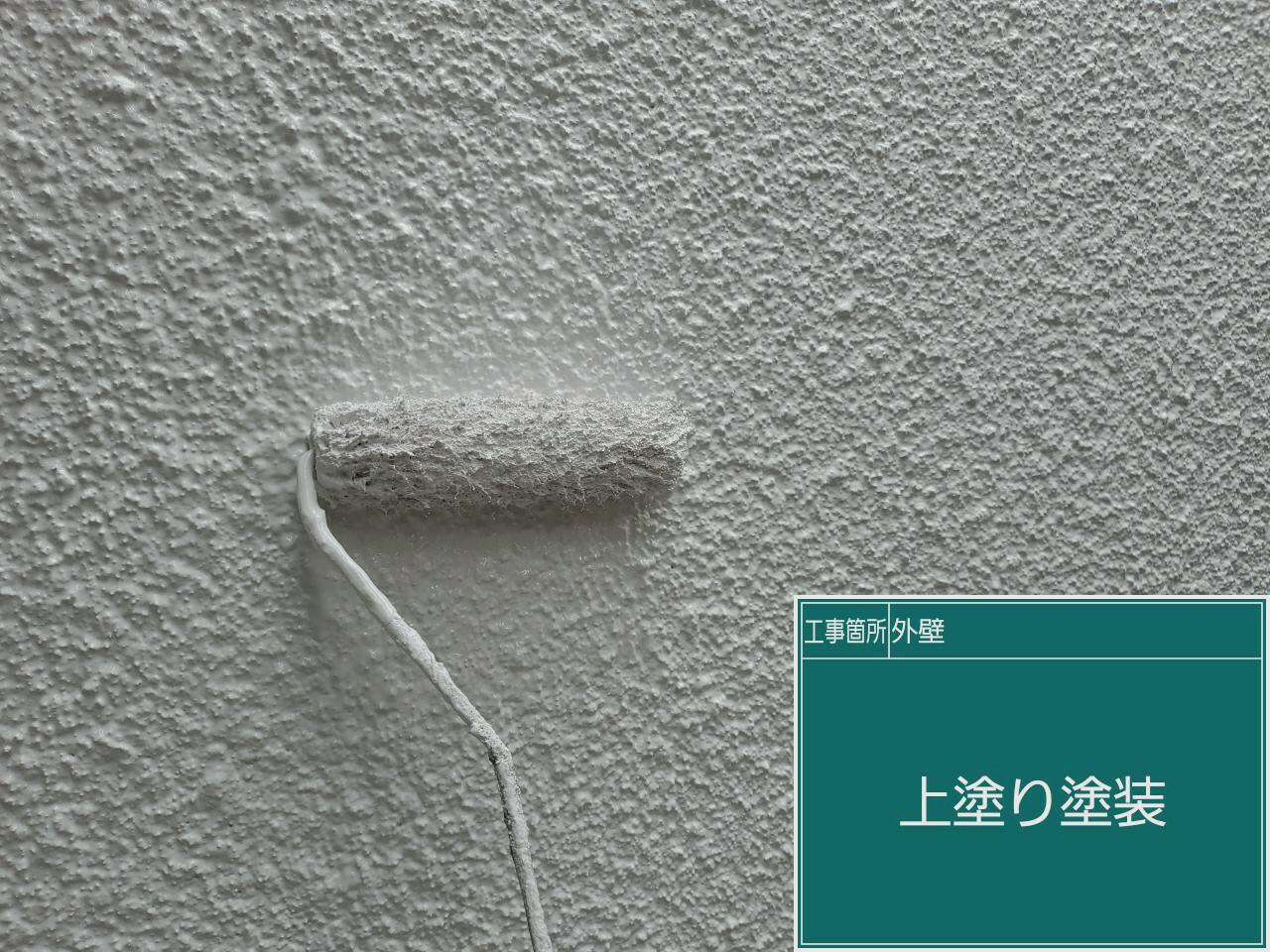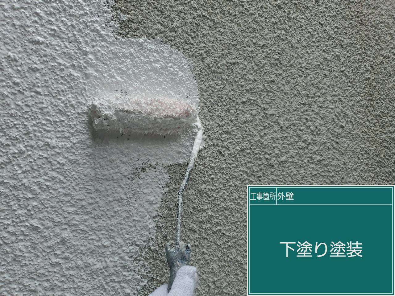 外壁の下塗り作業をしております。下塗りで下地と塗料の密着性を高めていきます。