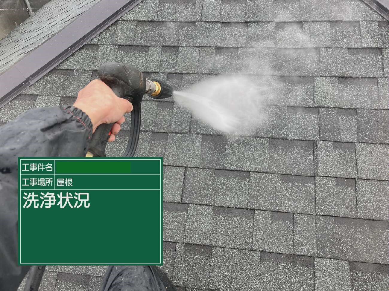 屋根には苔が付着しているので、しっかり洗い流していきます。