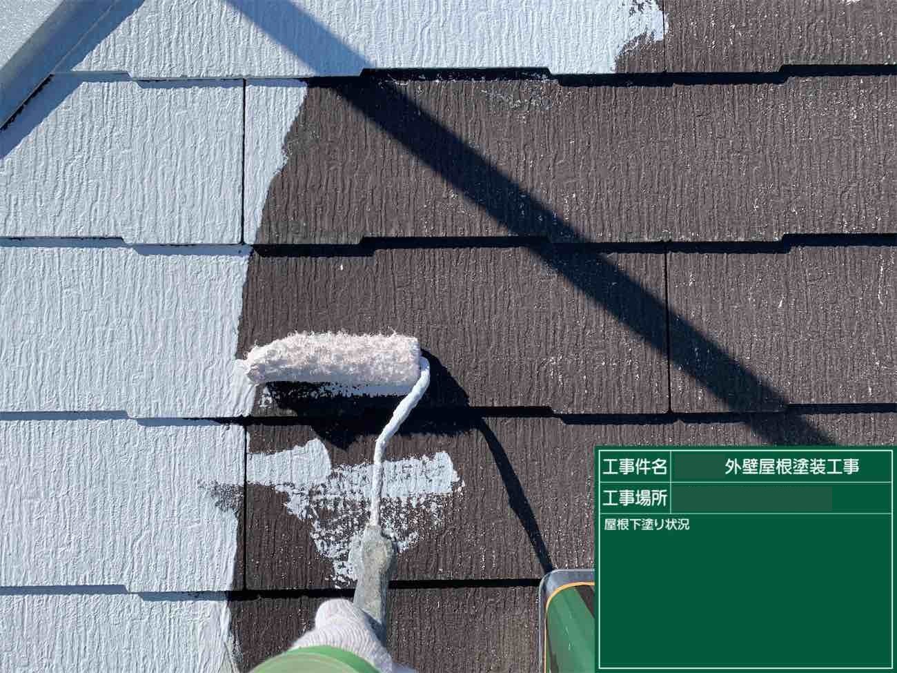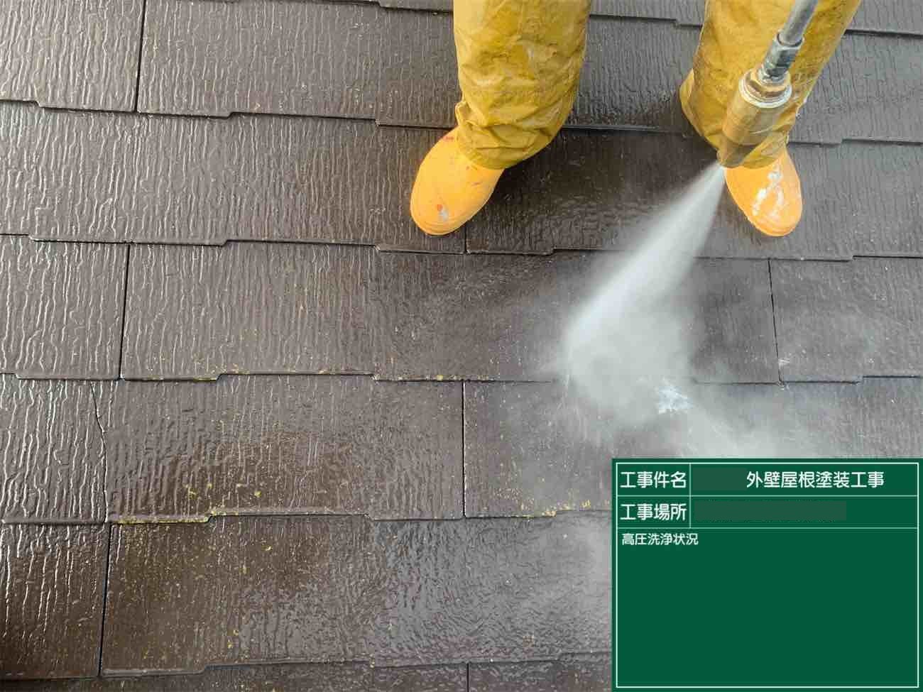 屋根の洗浄作業を行います。高圧洗浄機を用いて綺麗にしていきます。