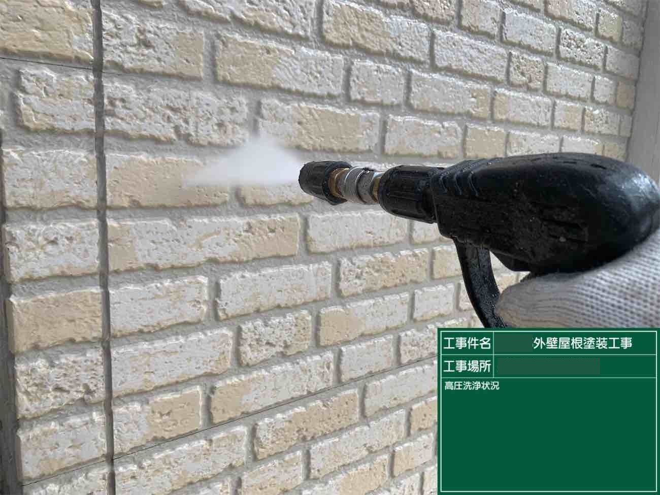 外壁も同様に洗浄作業を行います。洗浄で、ある程度汚れをおとしてから塗装工事に入ります。