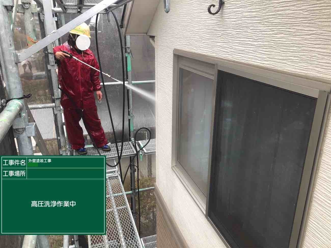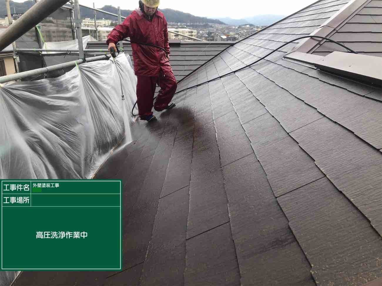 高圧洗浄機を使用し屋根の汚れを綺麗にしてから塗装作業に移ります。