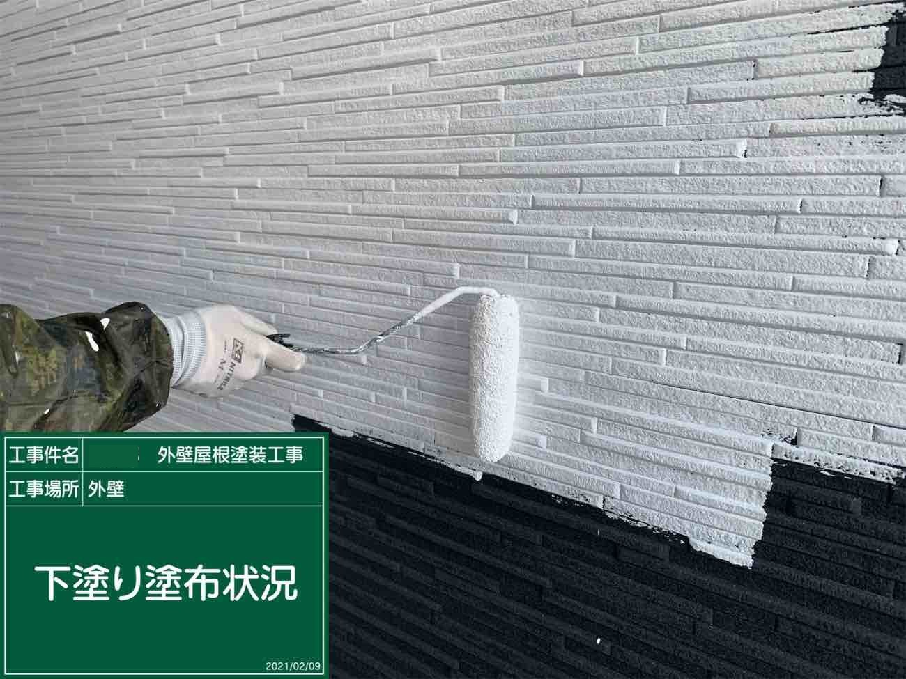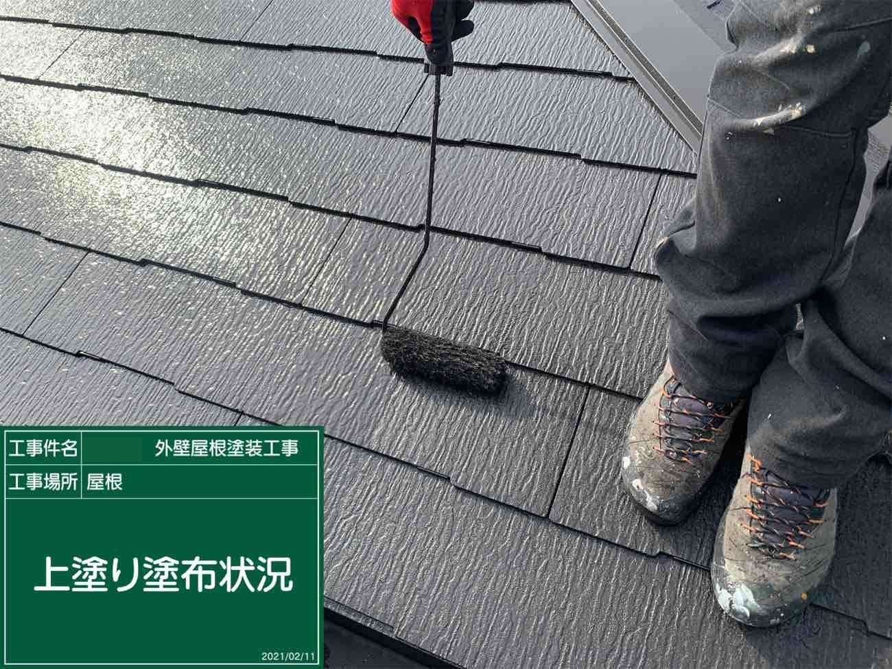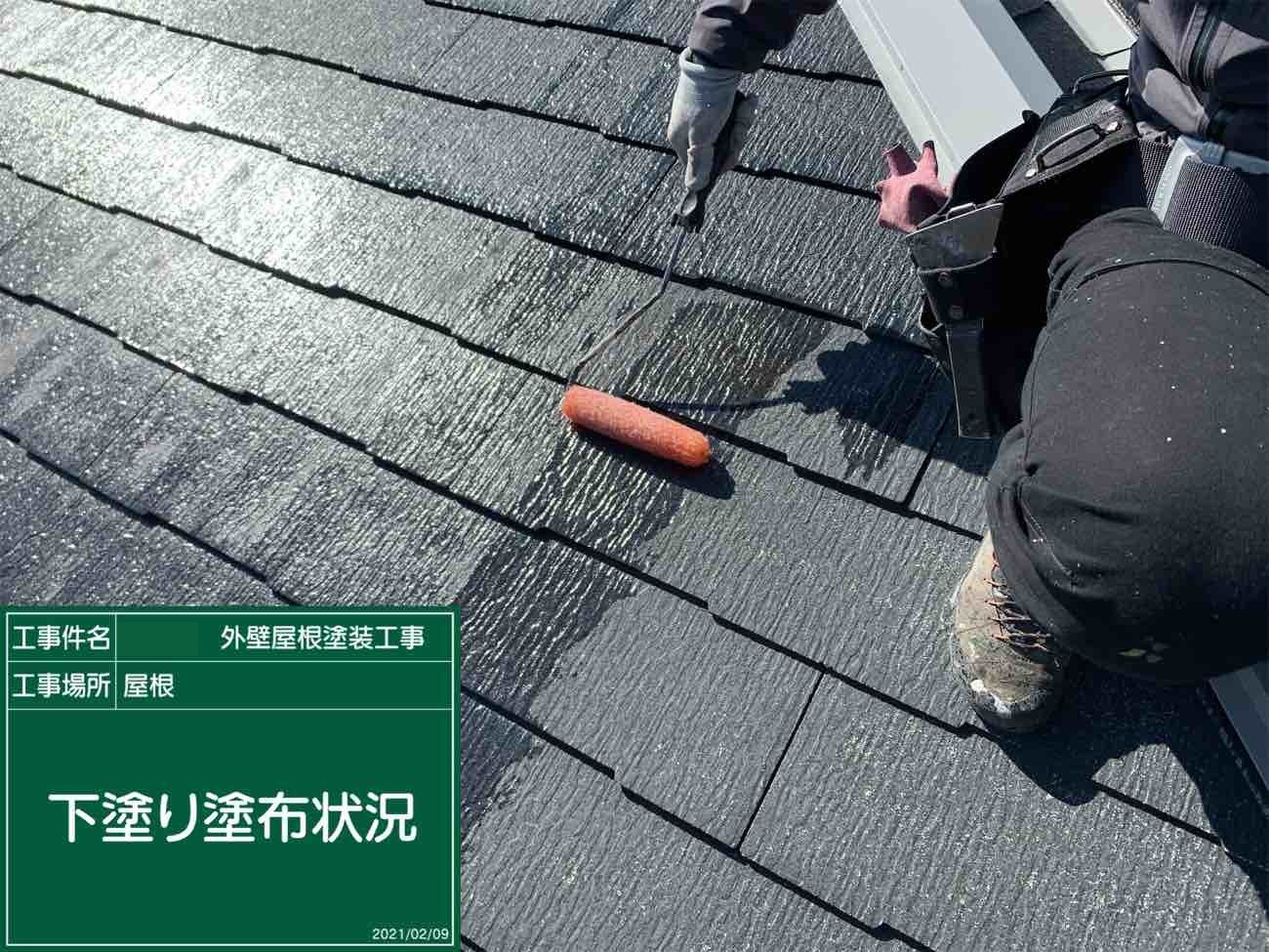 お屋根の下塗り作業の様子です。 下塗り作業はは中塗り材との密着度を高める非常に重要な役割です。