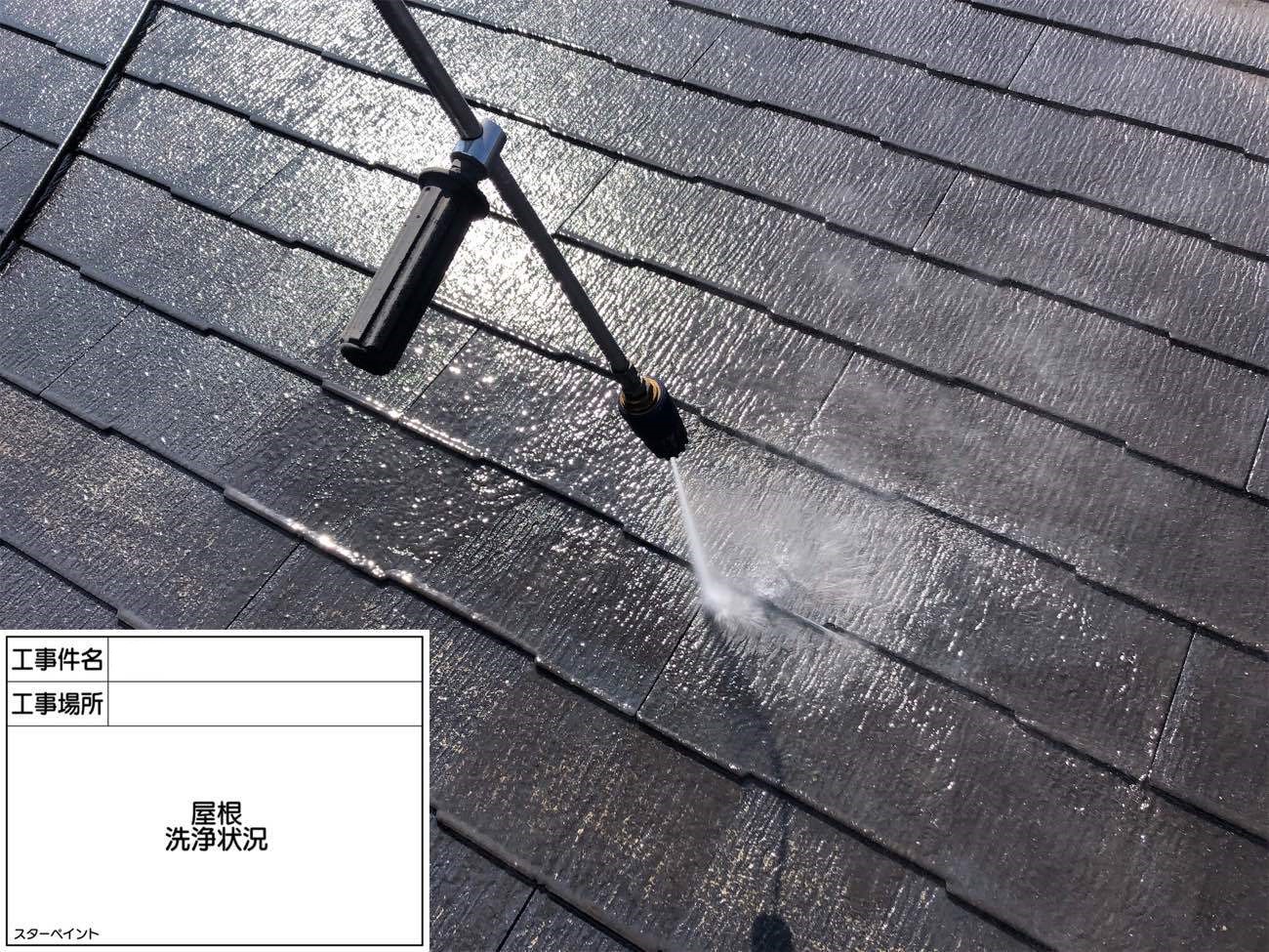 屋根には、紫外線や雨で汚れが付着しておりますので、高圧な洗浄機を使って 洗い流していきます。