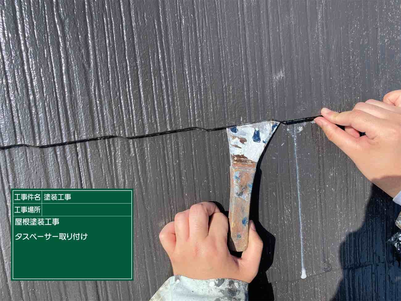 )瓦の基材の間にはタスペーサーという工具を使用します。写真のようにこれを差し込むことで空気の通り道が出来、屋根内部に湿気などがたまらないようになっております。