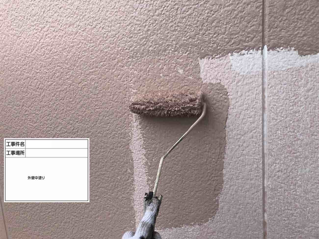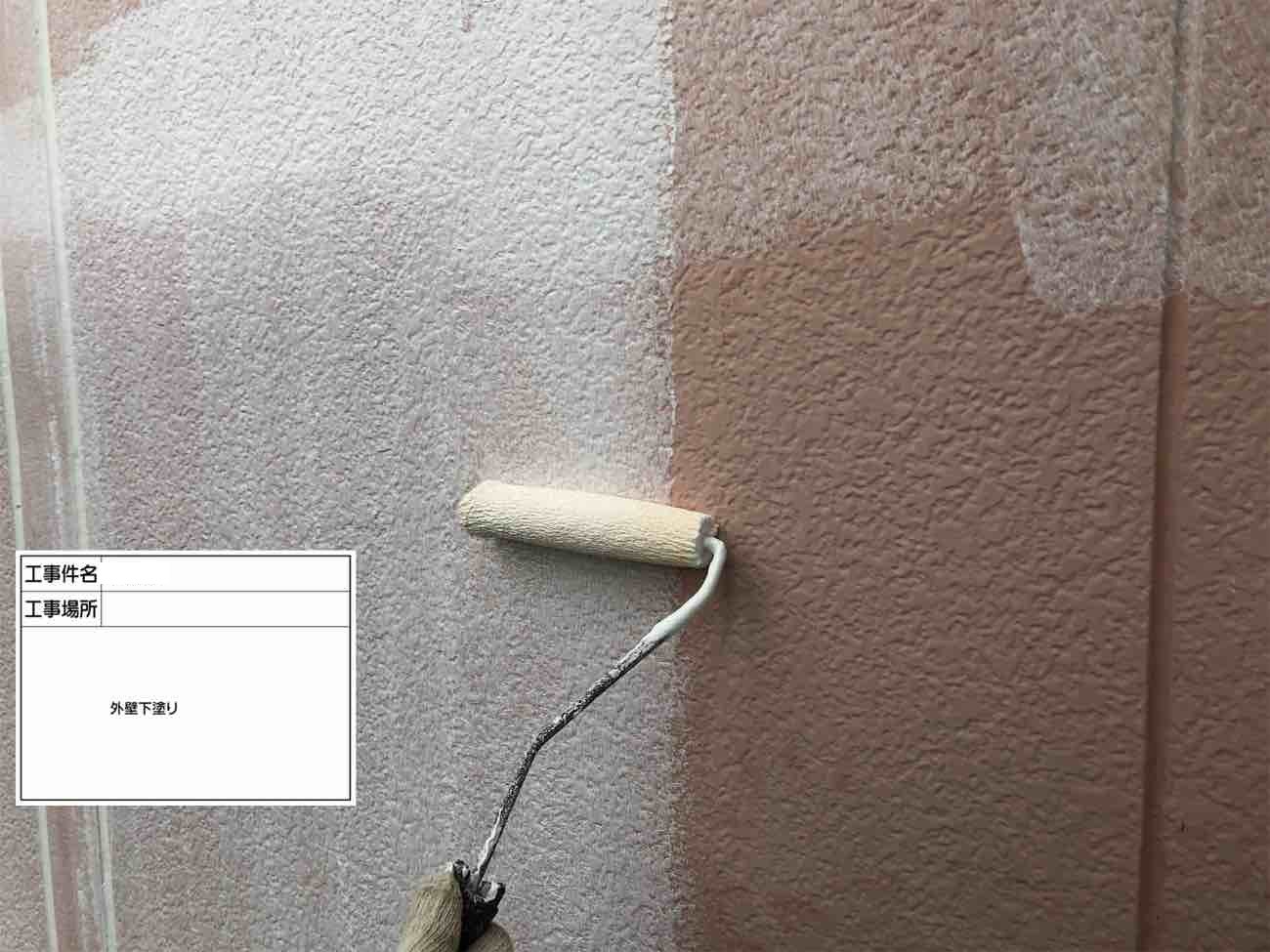 外壁の下塗りを行います。 下塗りでは、下地と上から塗る塗料の密着性を強めてくれます。