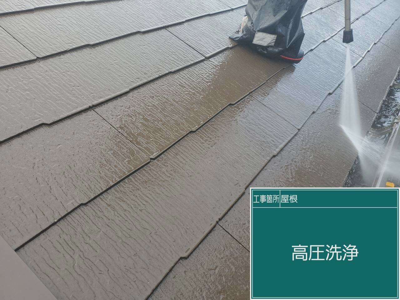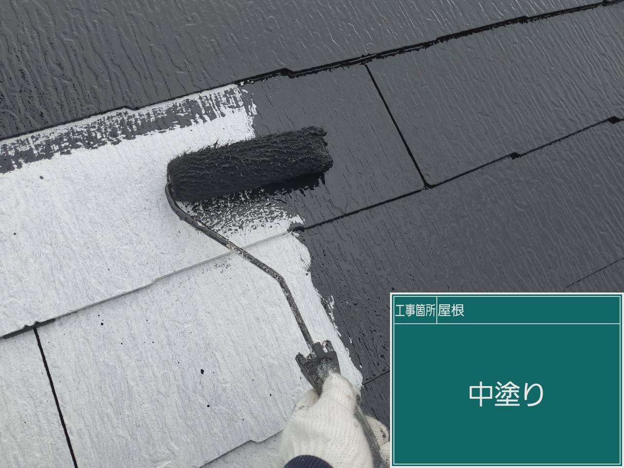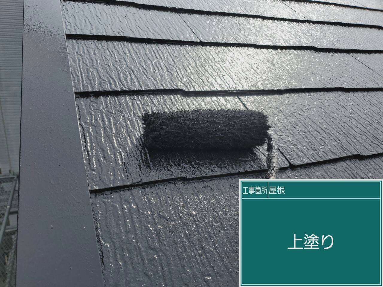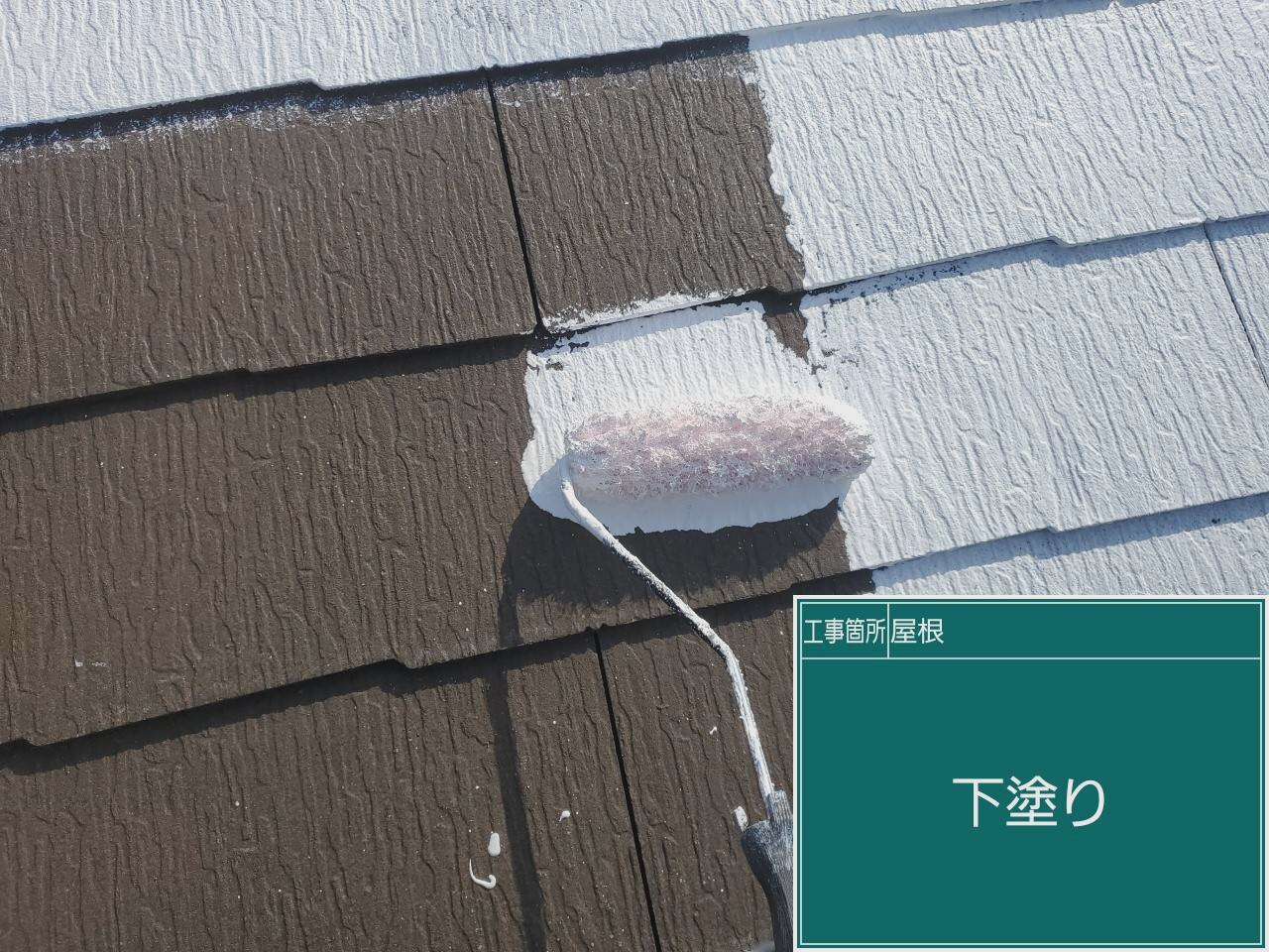 屋根の下塗りです。下塗りで下地と塗料の密着性を高めていきます。