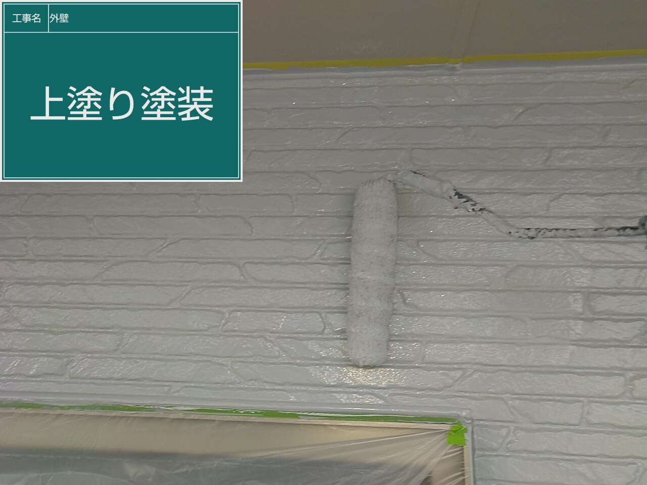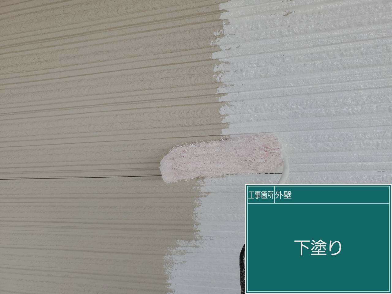 外壁塗装作業を行います。外壁も下塗りと中塗りと上塗りを行います。下塗り作業の写真です。