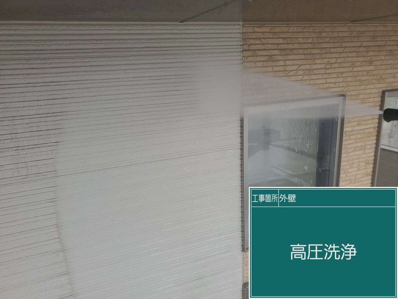 高圧洗浄から開始していきます。洗浄機の圧力を変動させながらきれいにしていきます。