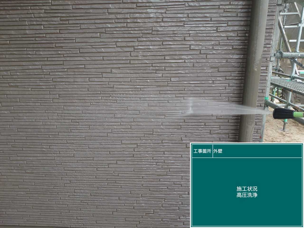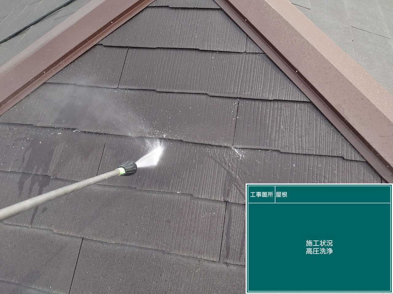 屋根の洗浄作業を行います。高圧洗浄機を使用し汚れを落としていきます。