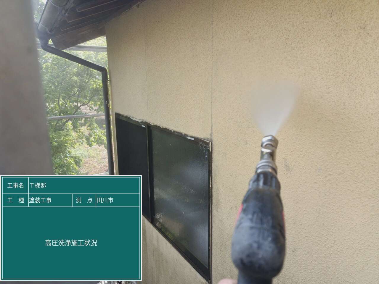 高圧洗浄機を使用し外壁のホコリ、汚れ、藻、コケ、カビなどを高圧の水で洗い流していきます。