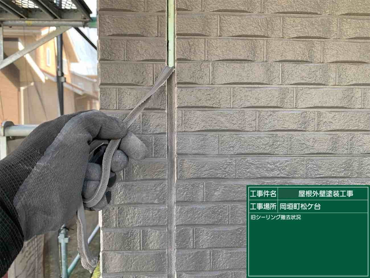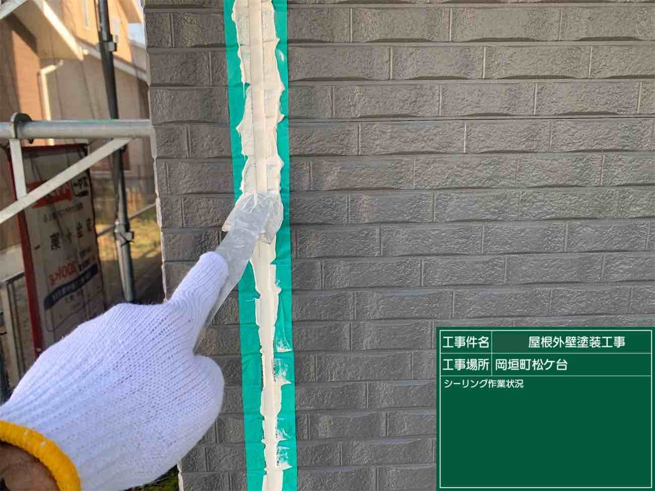 目地の底にボンドブレーカーを接着していきます。シーリングの3面接着を防ぎます。