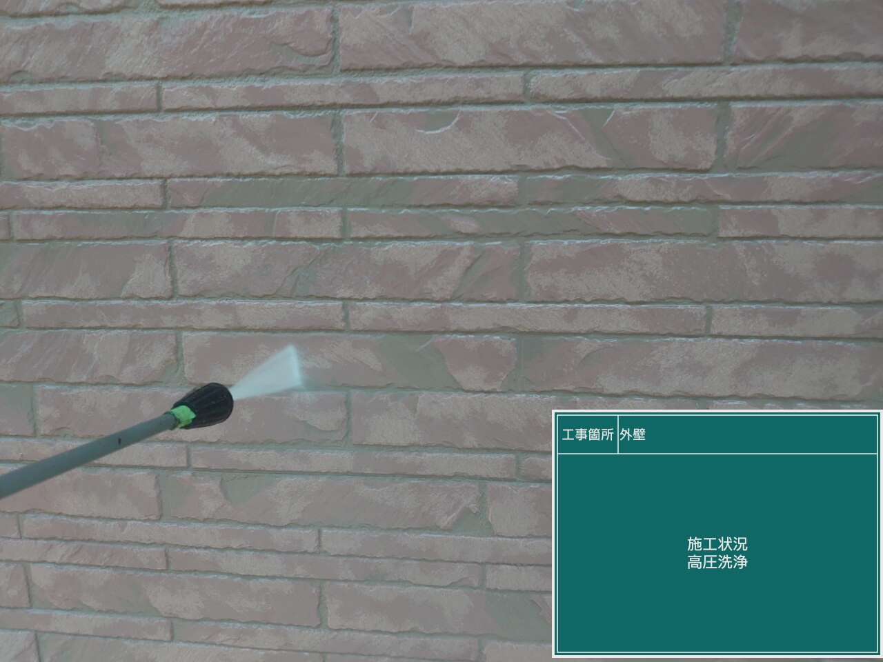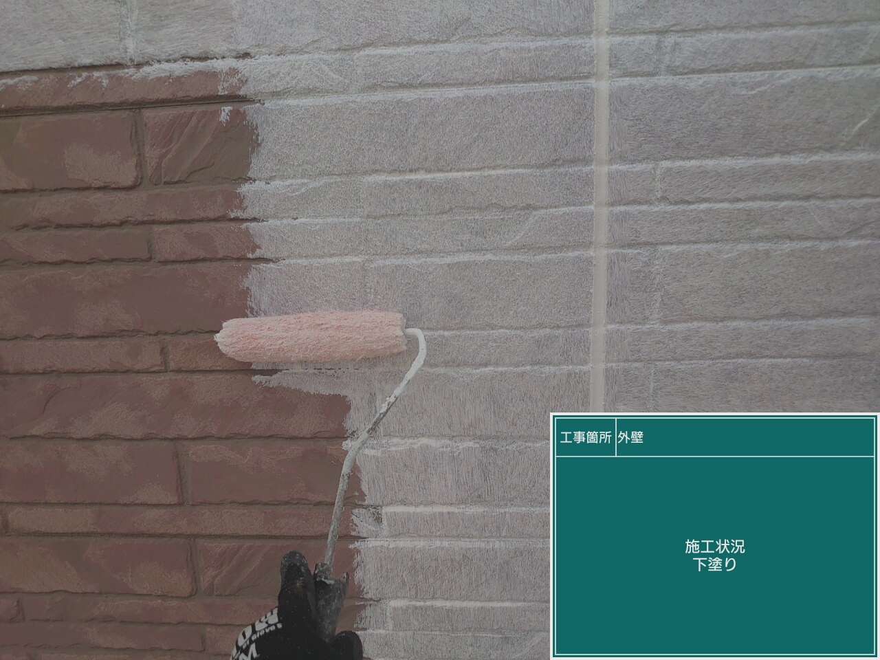 外壁の下塗り作業です。下塗りで上塗りの塗料の密着性を高めていきます。