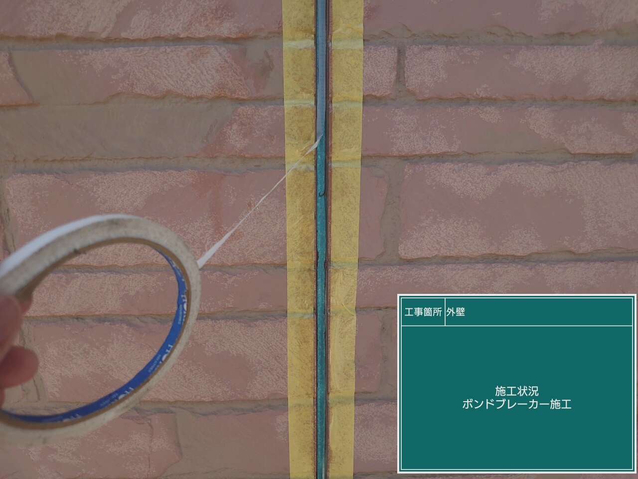 目地の底にボンドブレーカーを接着させ底にシーリング材が未着しないようにしていきます。