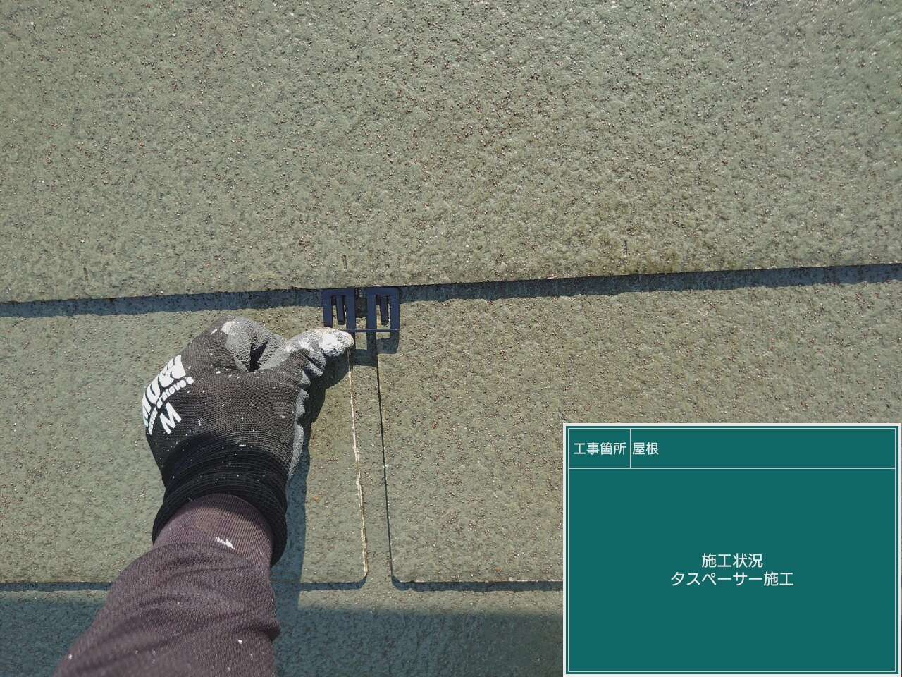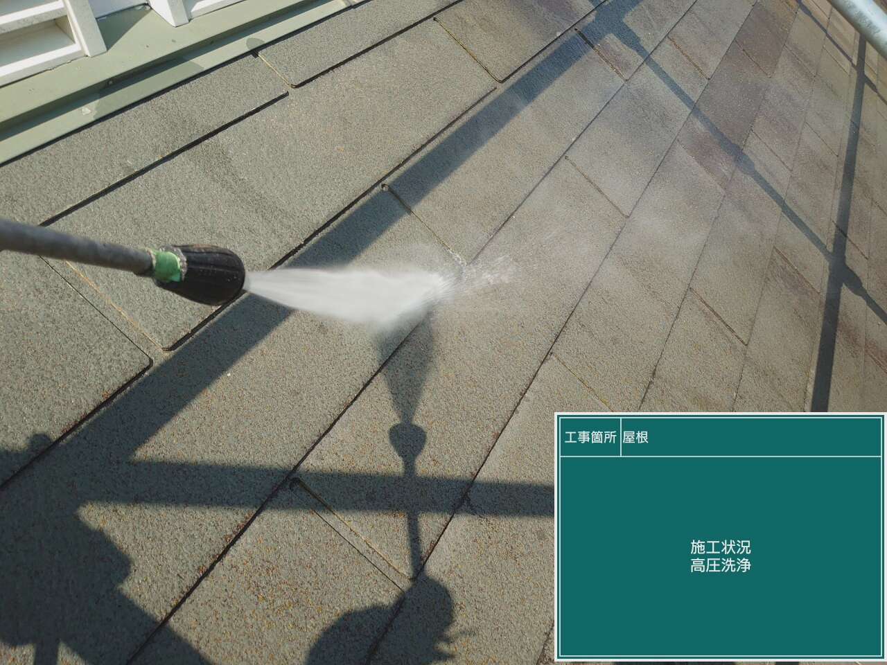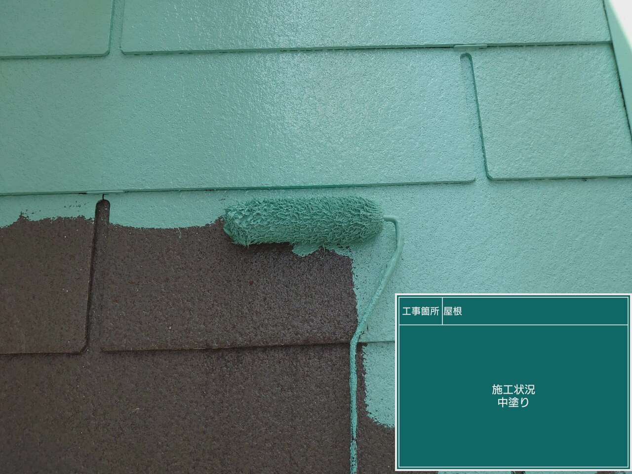 屋根の上塗り作業です。上塗りで仕上げます。