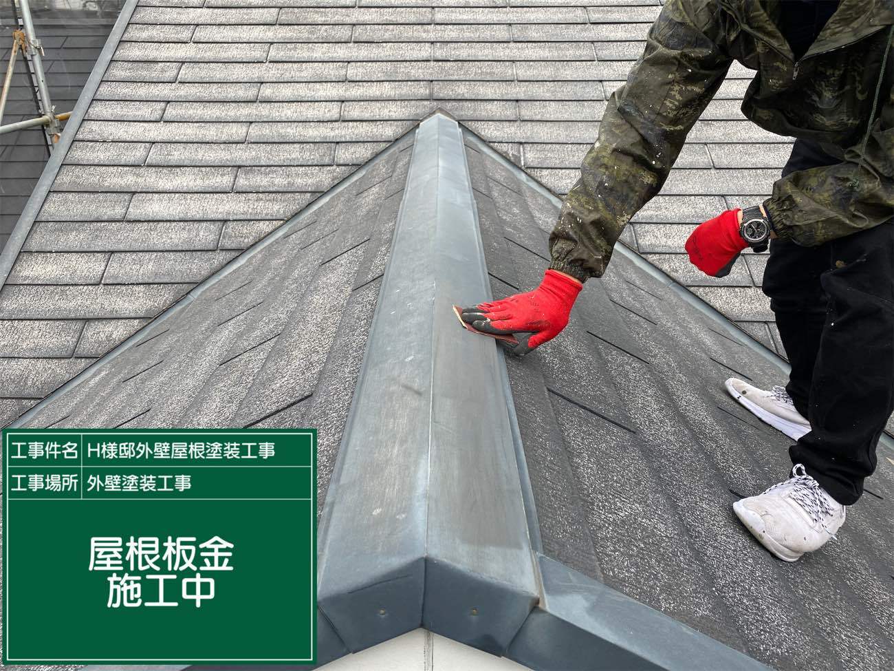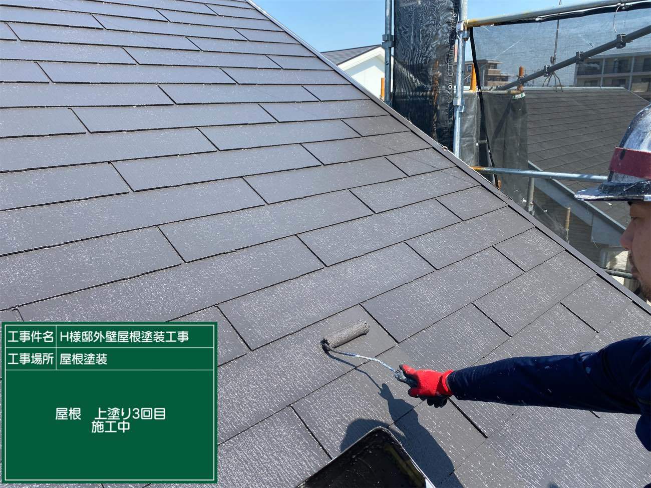 下塗りです。縦にちょんちょんと塗られているのは瓦の狭いスキマの部分。凹凸が深くローラーではうまく塗料がのらないので先に刷毛などでこのように塗ってしまうのです。
