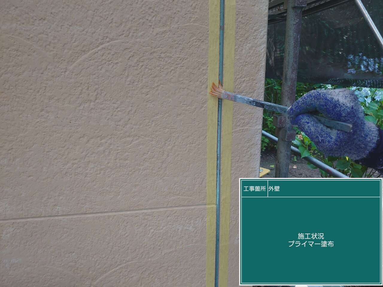 塗装作業を見ていきましょう。これは外壁の下塗り作業です。下塗り作業では外壁材の下地と塗料が密着しやすくなるようにする工程になります。