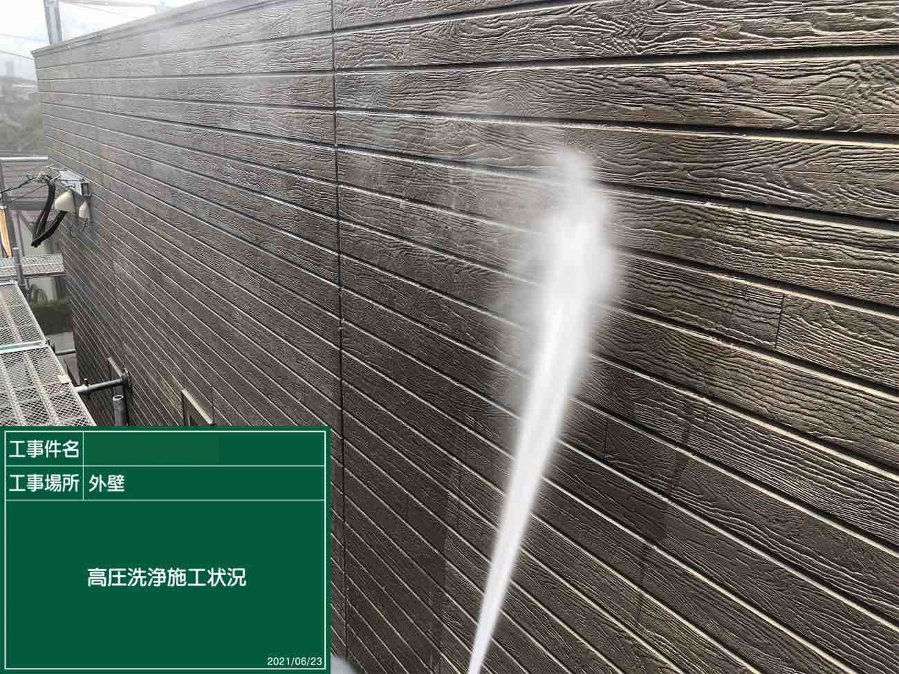 まずは高圧洗浄作業で外壁についた汚れを落としていきます。