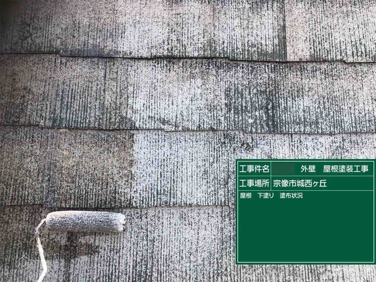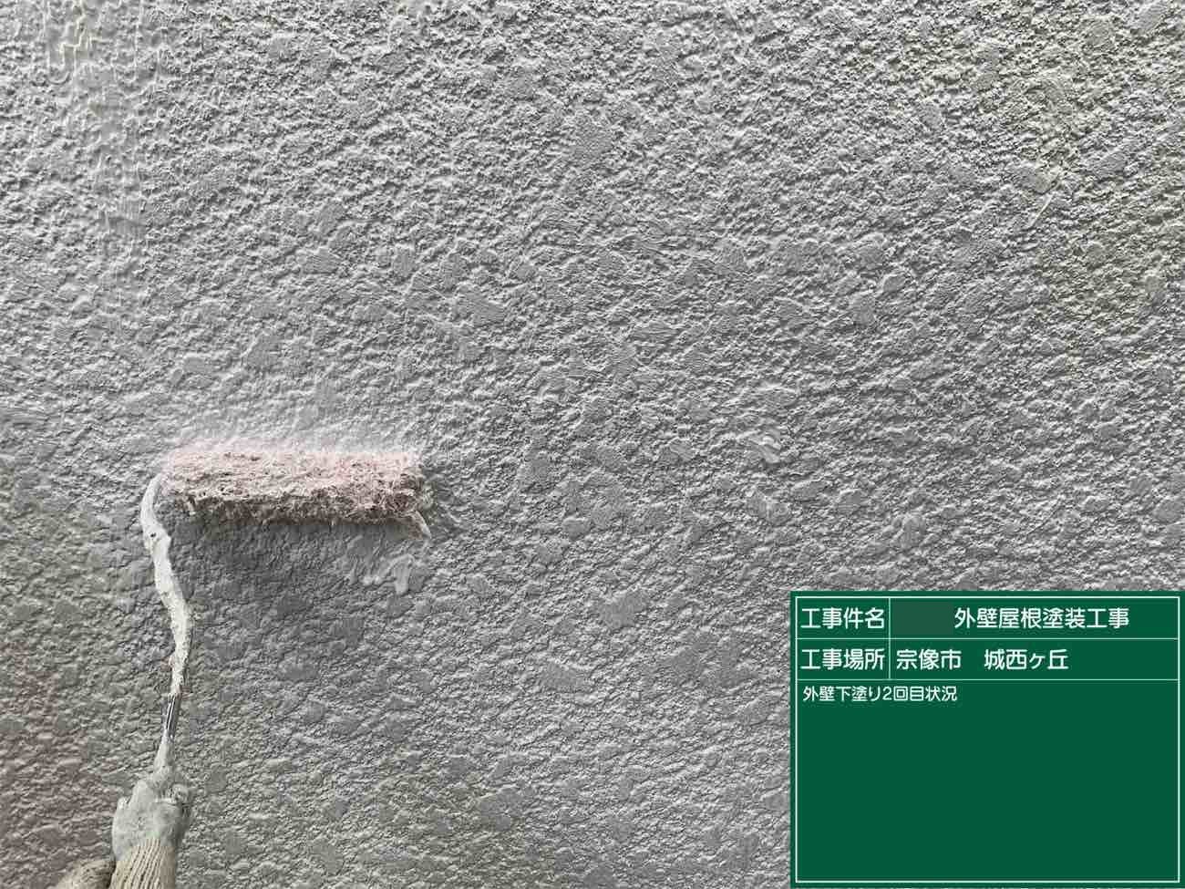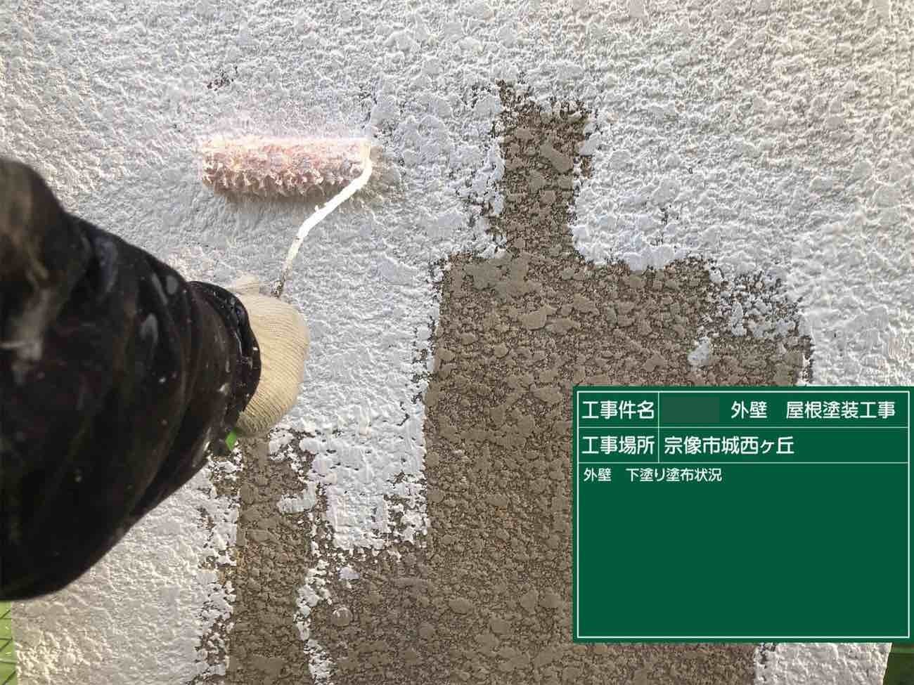 外壁の下塗り作業を行います。今回は劣化の度合いから2階塗装を行います。