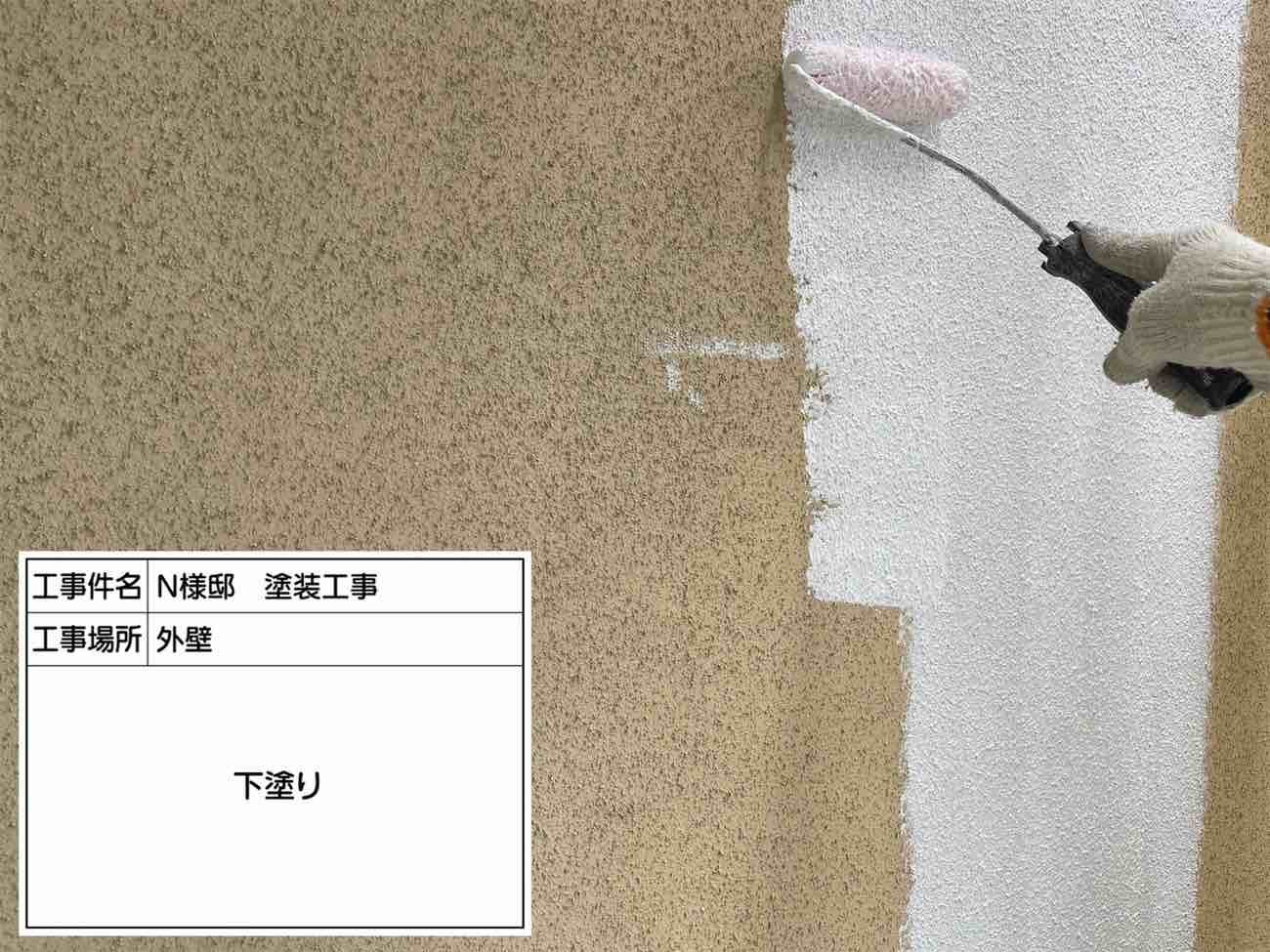 高圧洗浄を行い綺麗にした外壁に下塗り材を塗布していきます。