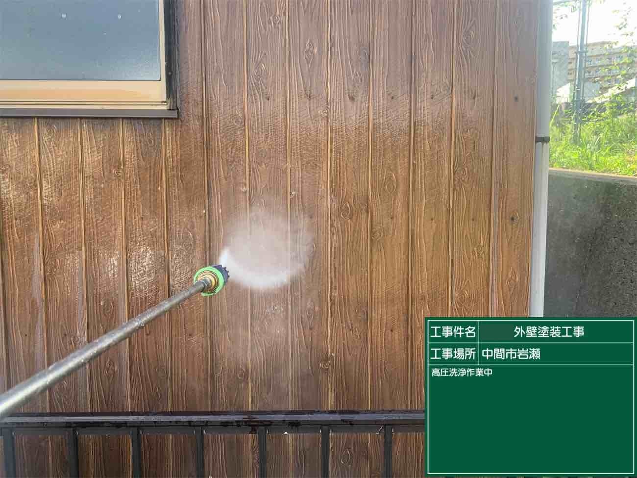 外壁の洗浄作業を行います。汚れを洗浄で落としていきます。
