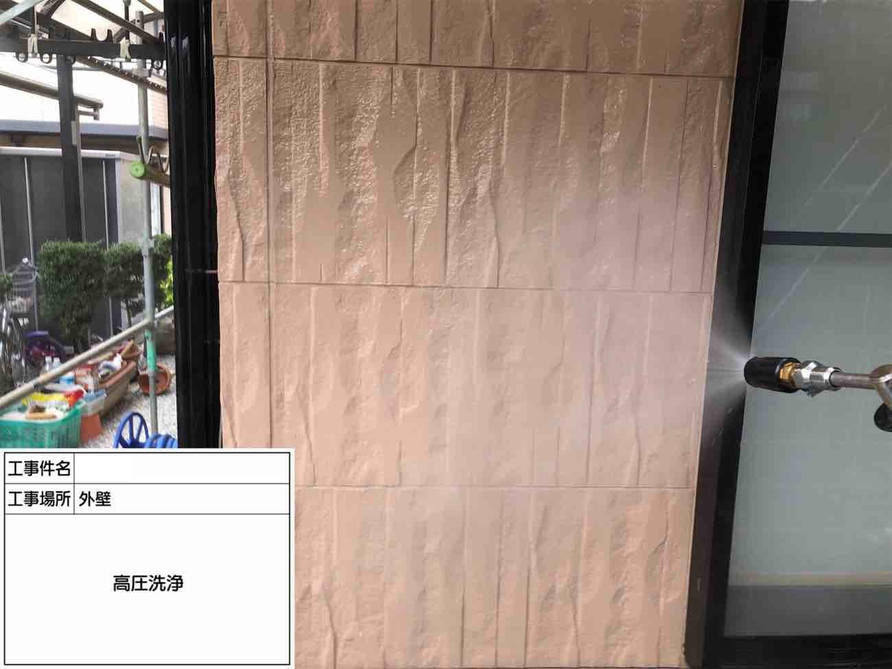 外壁の高圧洗浄作業です。 高圧洗浄作業で汚れを綺麗に落としていきます。