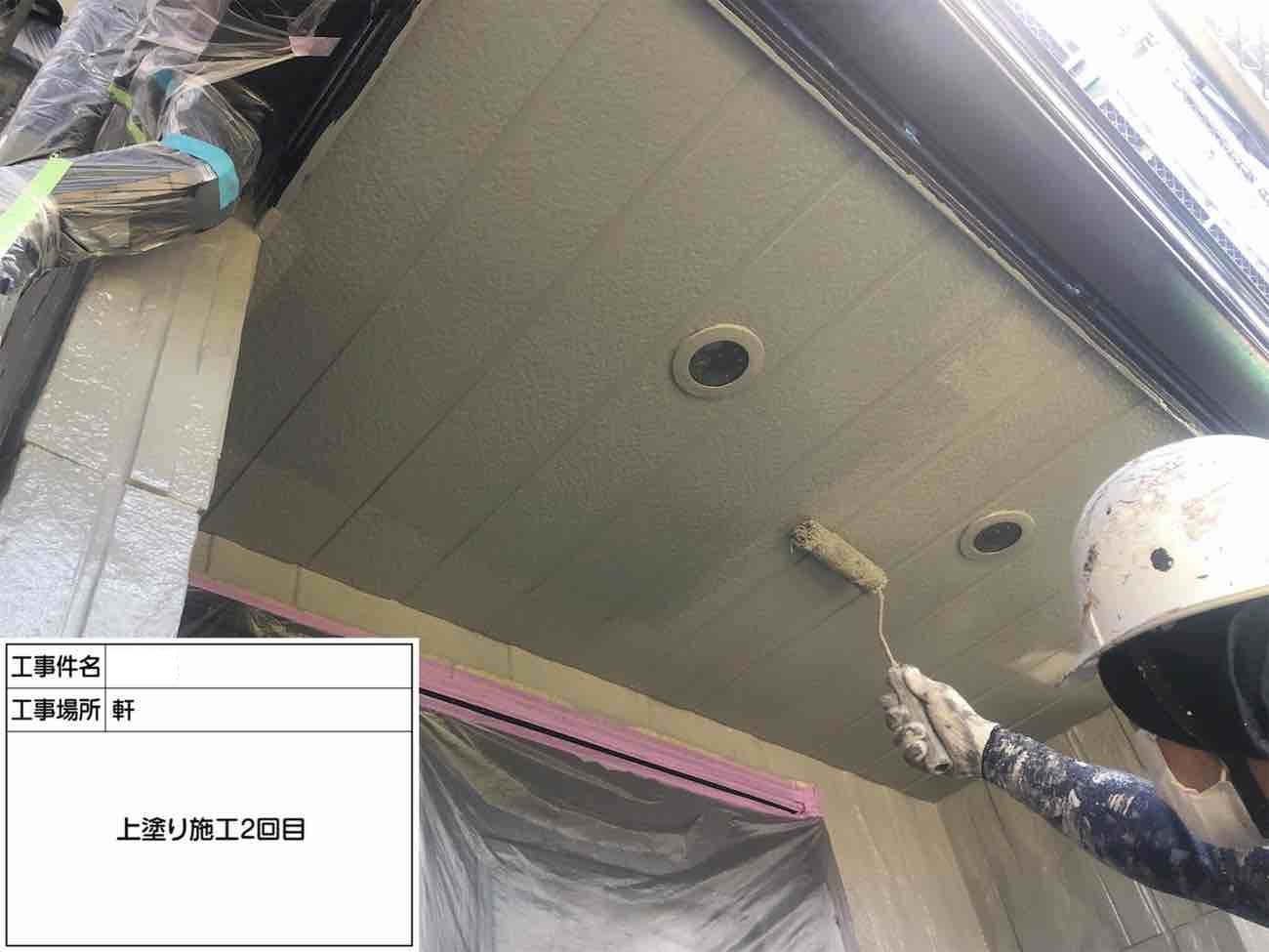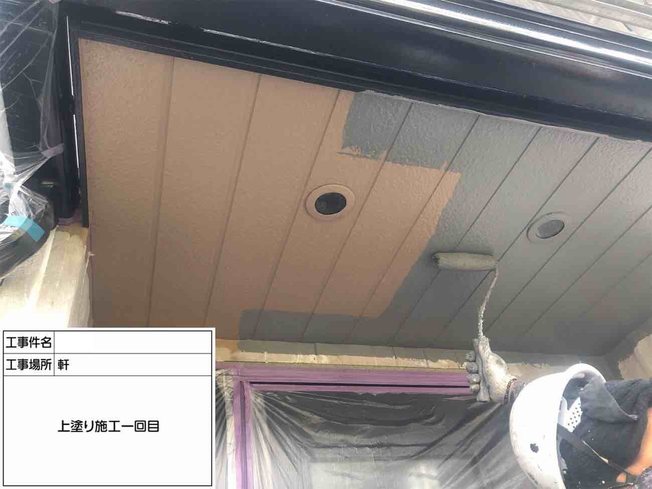 軒天の上塗り1回目です。 この工程で色を入れていきます。