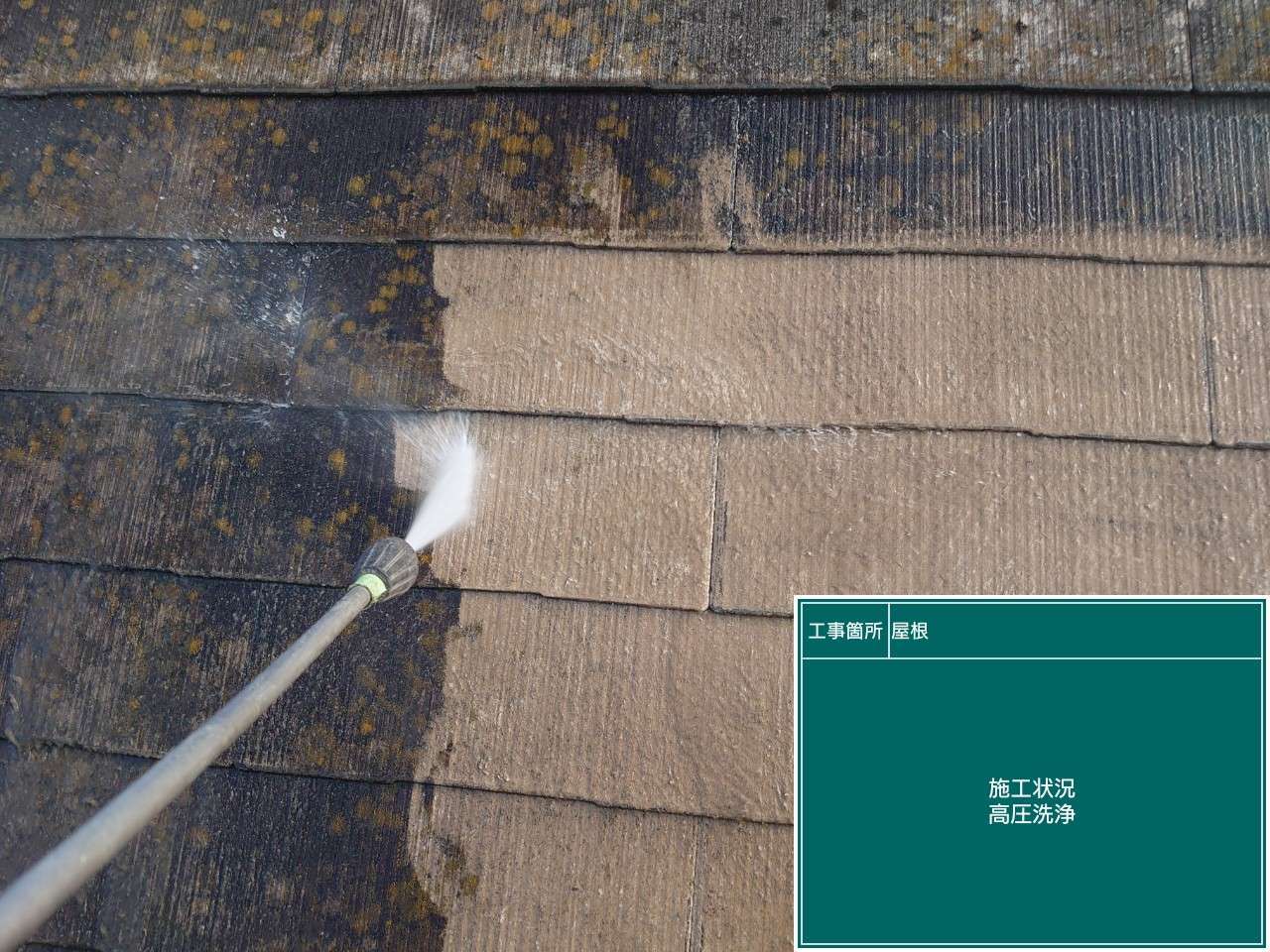 まずは屋根の高圧洗浄を行い細かな汚れまで落としていきます。