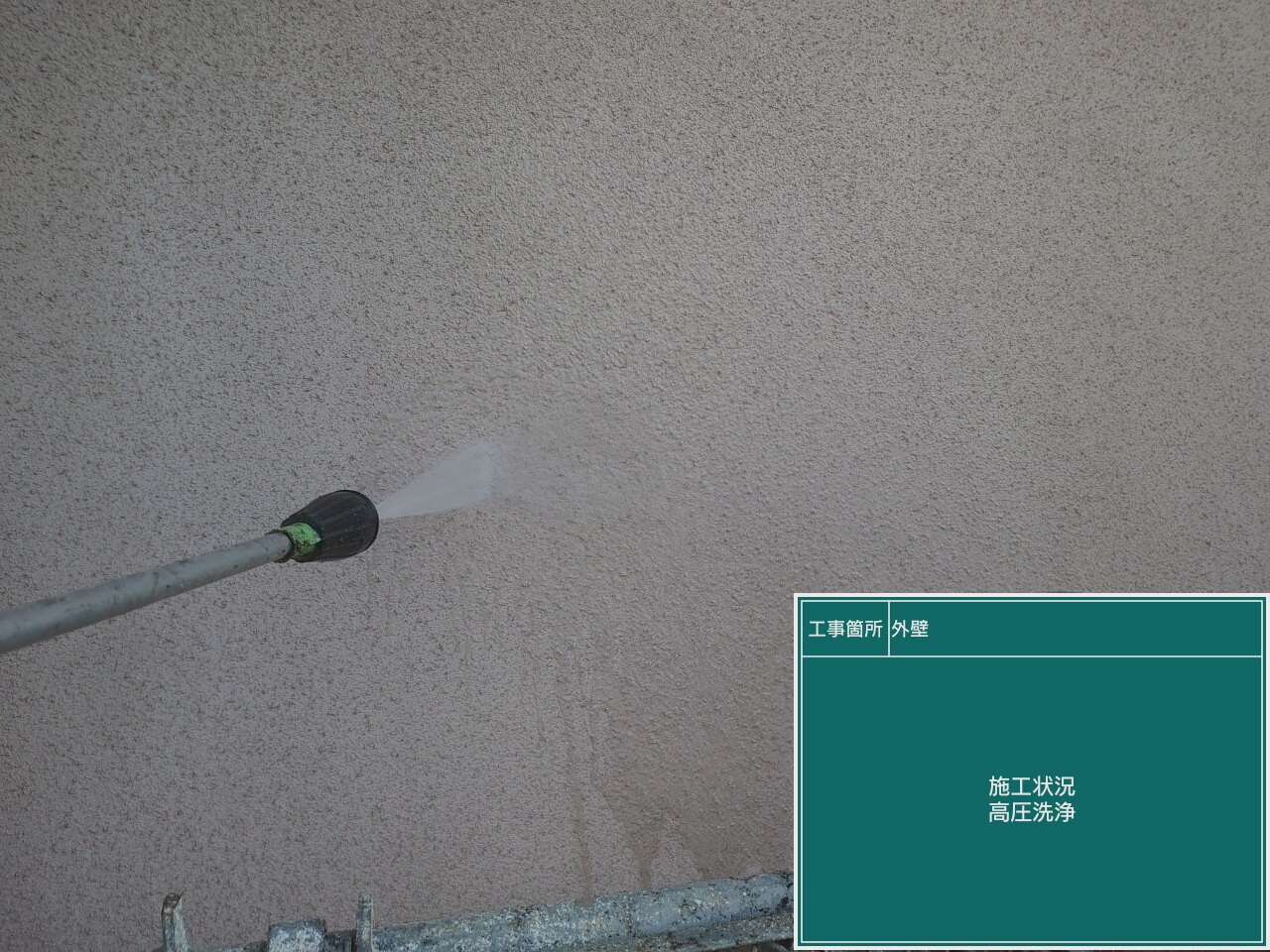 外壁の高圧洗浄作業です。 高圧洗浄作業で汚れを綺麗に落としていきます。
