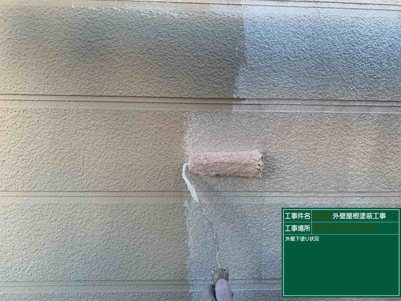 外壁の下塗り塗装作業です。下塗りで上塗り塗料の密着性を高めます。