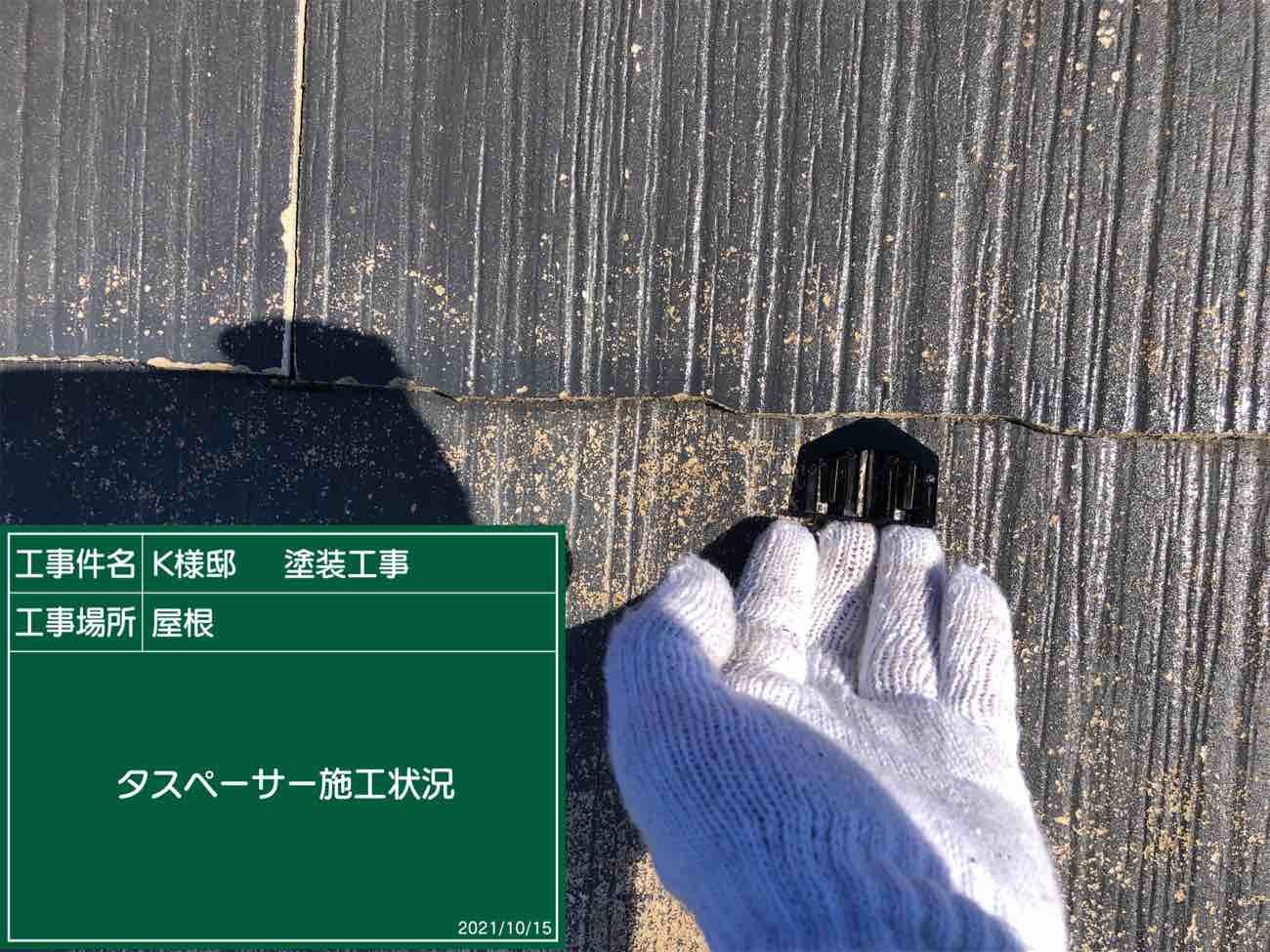 タスペーサーを一つ一つ手作業で取り付けていきます。 取付けることにより雨漏りを防ぐ役割があります。