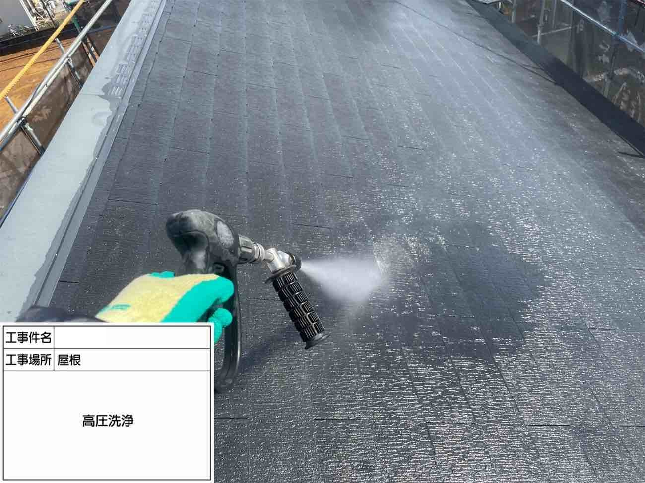 まずは高圧洗浄作業で屋根についた細かな汚れも綺麗に落としていきます。