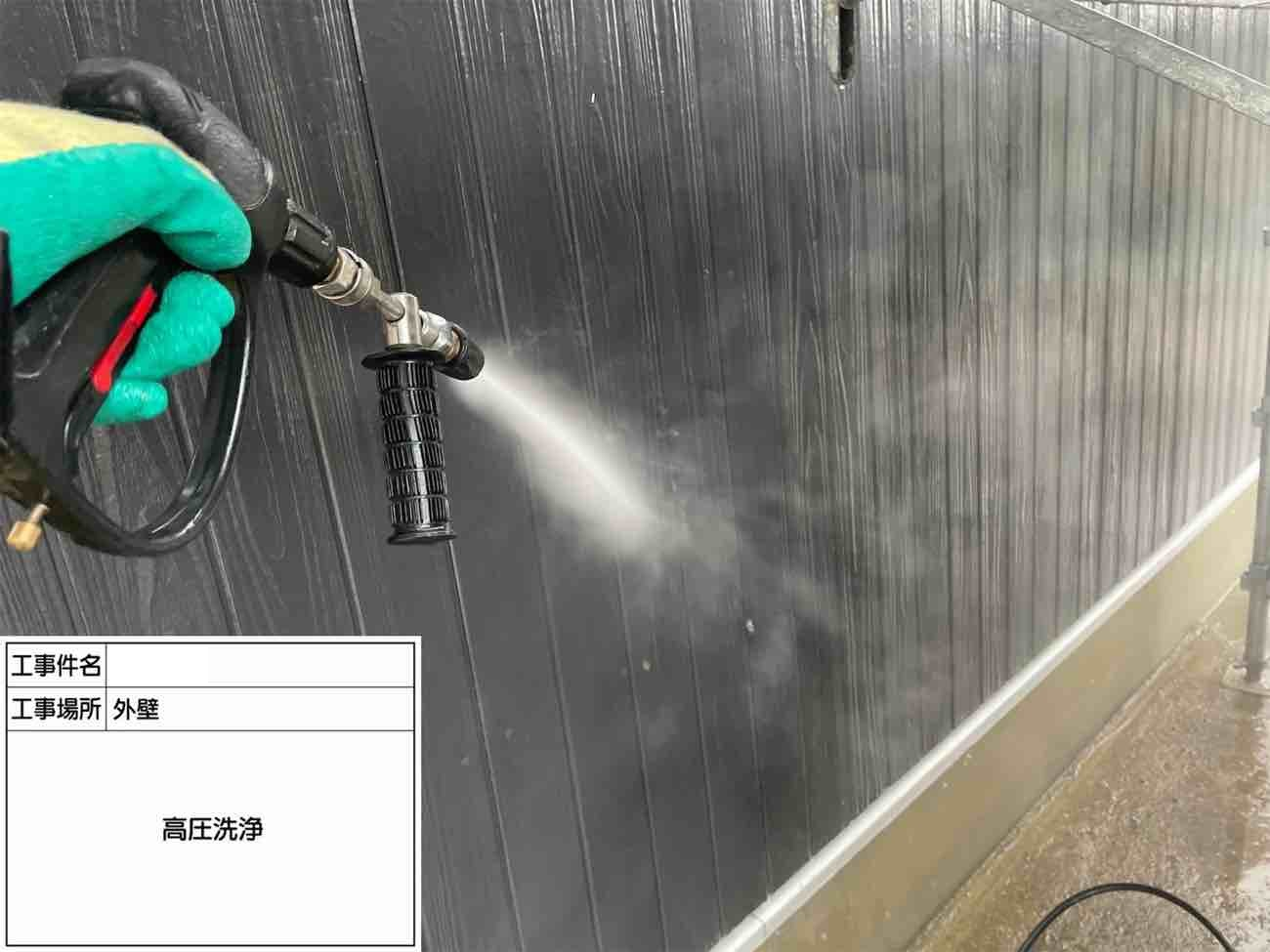 屋根と同様、外壁も高圧洗浄を行い細かな汚れも落としていきます。 塗料を塗る前に綺麗にすることはとても大事な作業です。