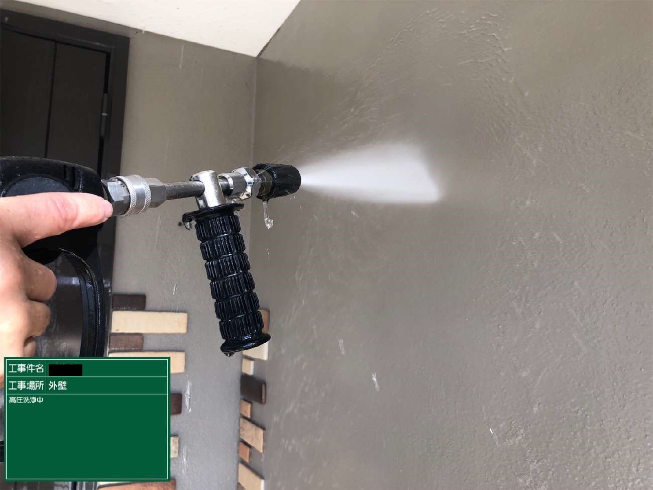 外壁の高圧洗浄中の様子です。 高圧のお水で外壁に付着した汚れやコケ・カビなどの微生物、古い塗膜を洗い流していきます。